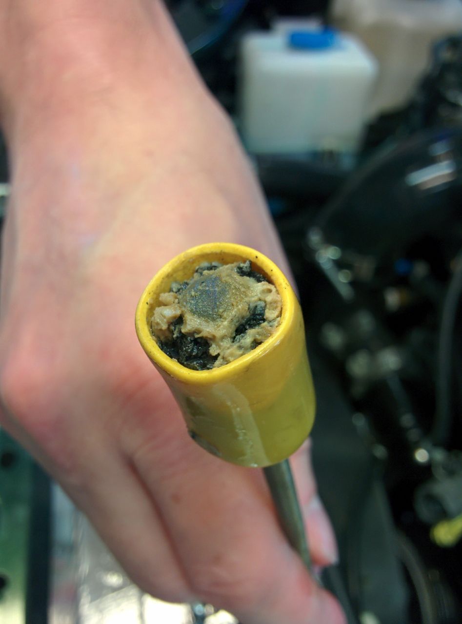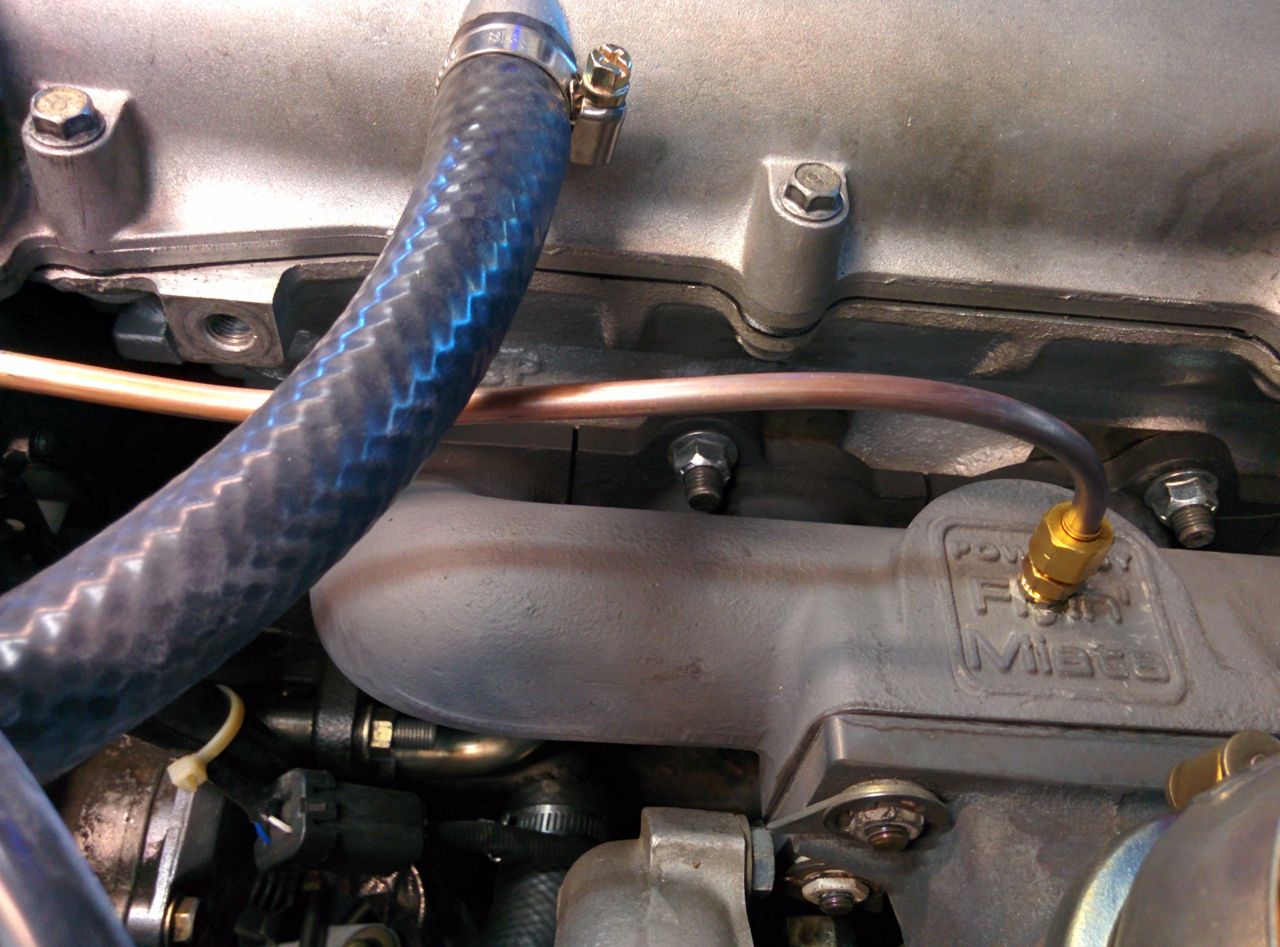 Then it was time to measure some pressures and see why the turbo isn't making the power I expected it to. I decided to start with turbine inlet pressure. First, we pop the EGT sender out and put in a compression fitting with some copper tubing: