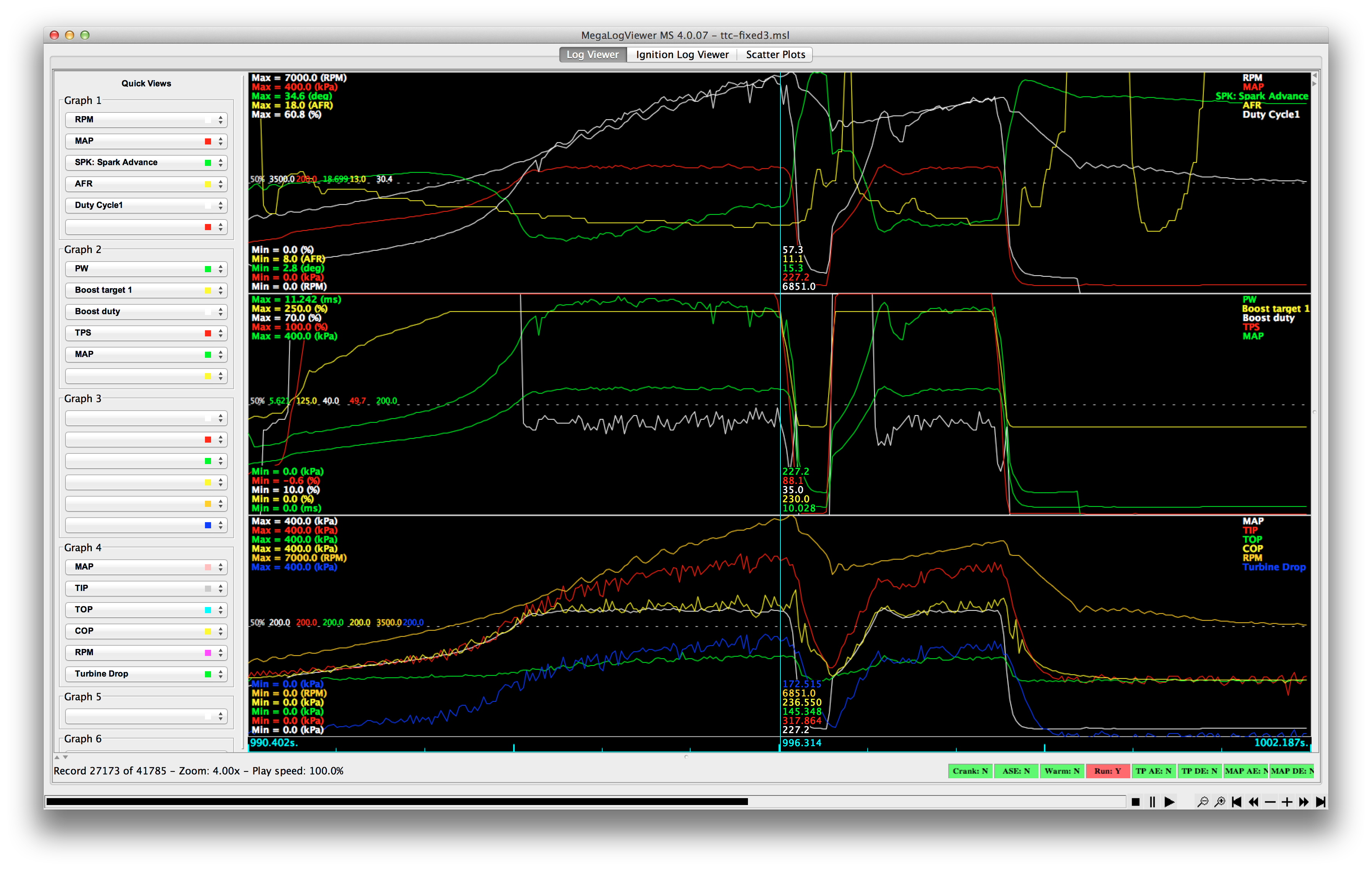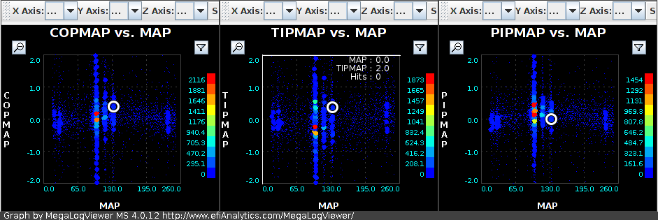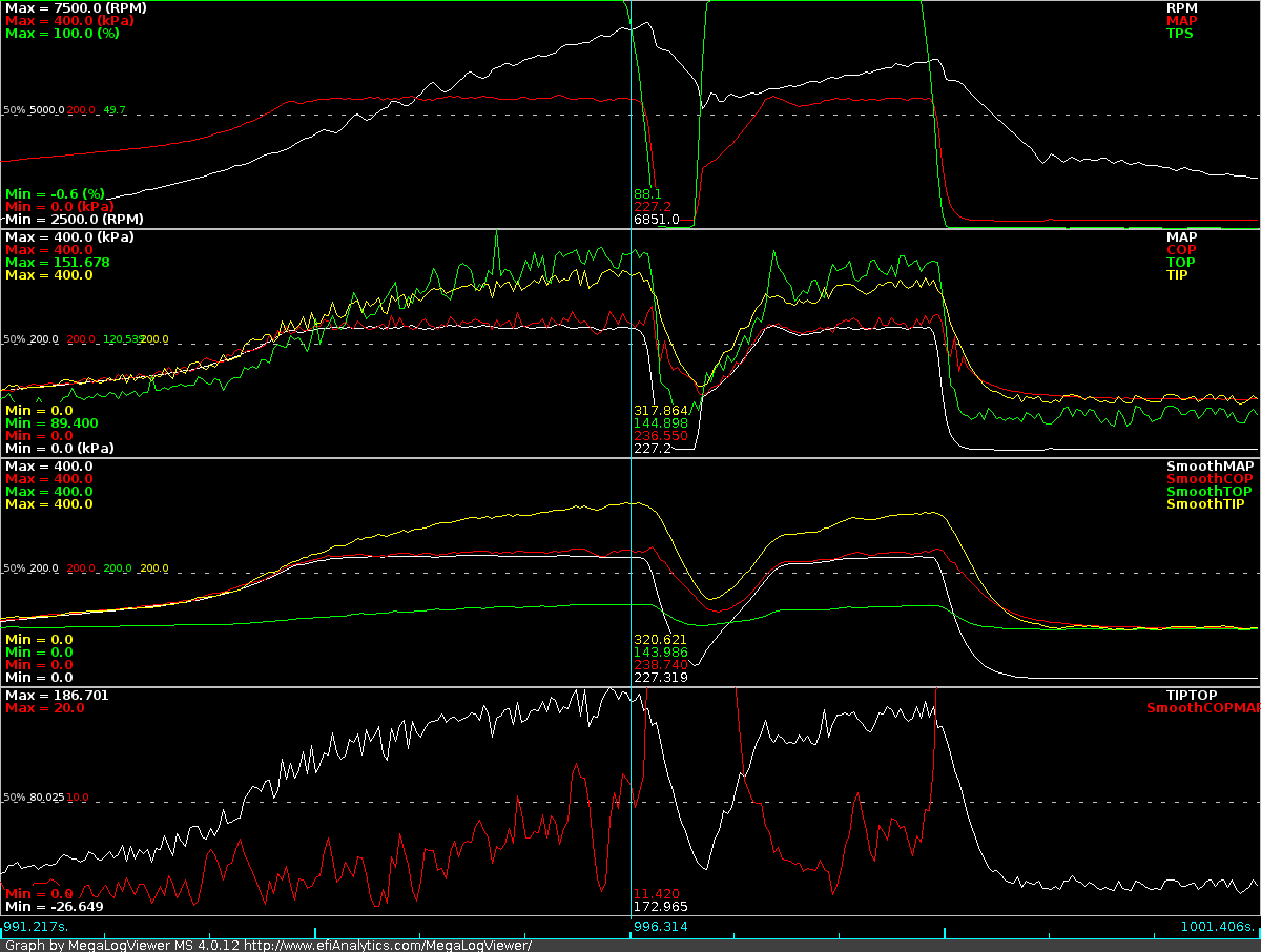 Here's the same data as from post #213. I've included MLV's smoothbasic(y, 5) for each of the 4 sensors (third chart), "[TIP] - [TOP]" (white on the bottom one), and "smoothbasic([COP] - [MAP], 5)" (red on the bottom chart).