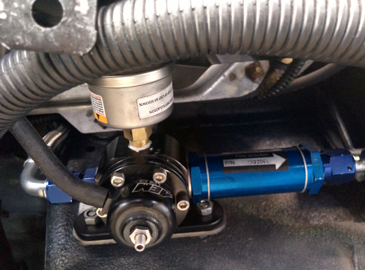 Spent some more time messing with the fuel system today. First, I got another straight -6 AN adapter from FM, put that in in place of the 90 degree, and the feed line to the AEM is much happier: