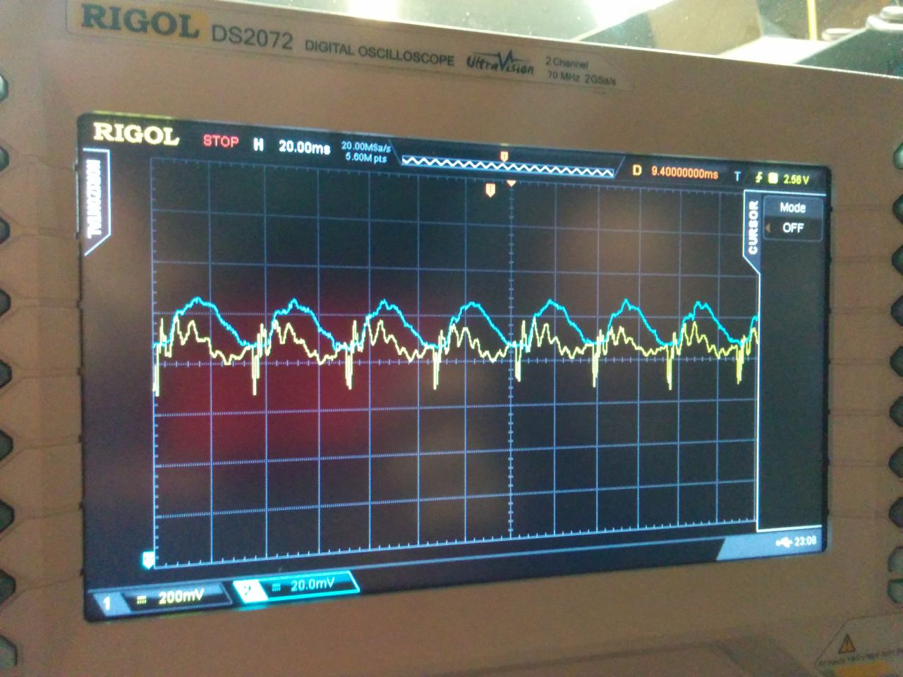 I also ran a manifold reference to the AFR, and set the base pressure to 45 psi. It started up, we took it out and retuned the VE table for the new pressure reference, things looked good, but noticed that the fuel pressure was a lot noisier than it had been before. After dinner we grabbed TK's oscilloscope and looked at the variance in the fuel pressure (yellow) vs the MAP sensor (blue):