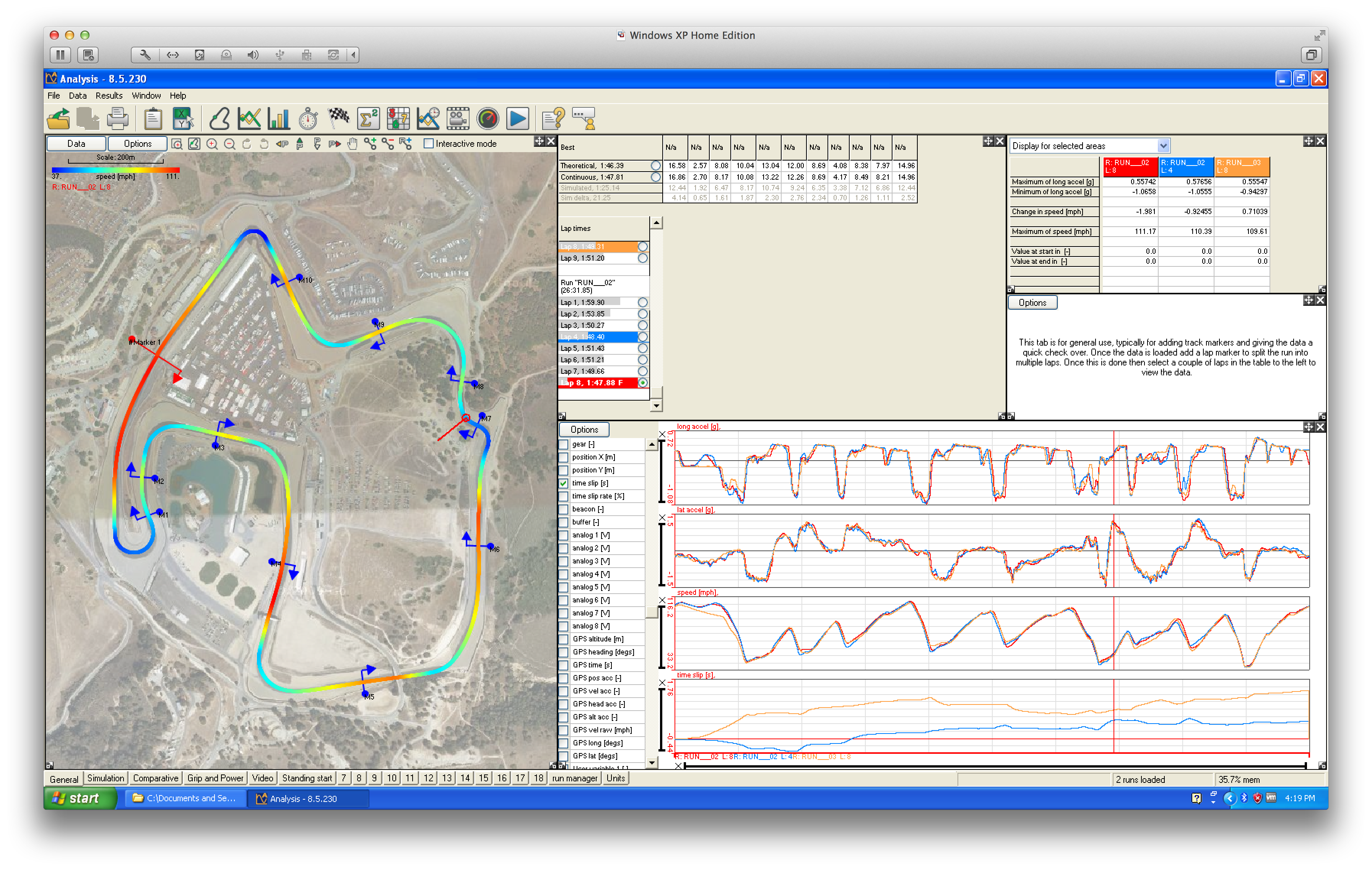 The really important part of a data logging system is actually not the logging -- it's the analysis end. For example, this is comparing three different laps: