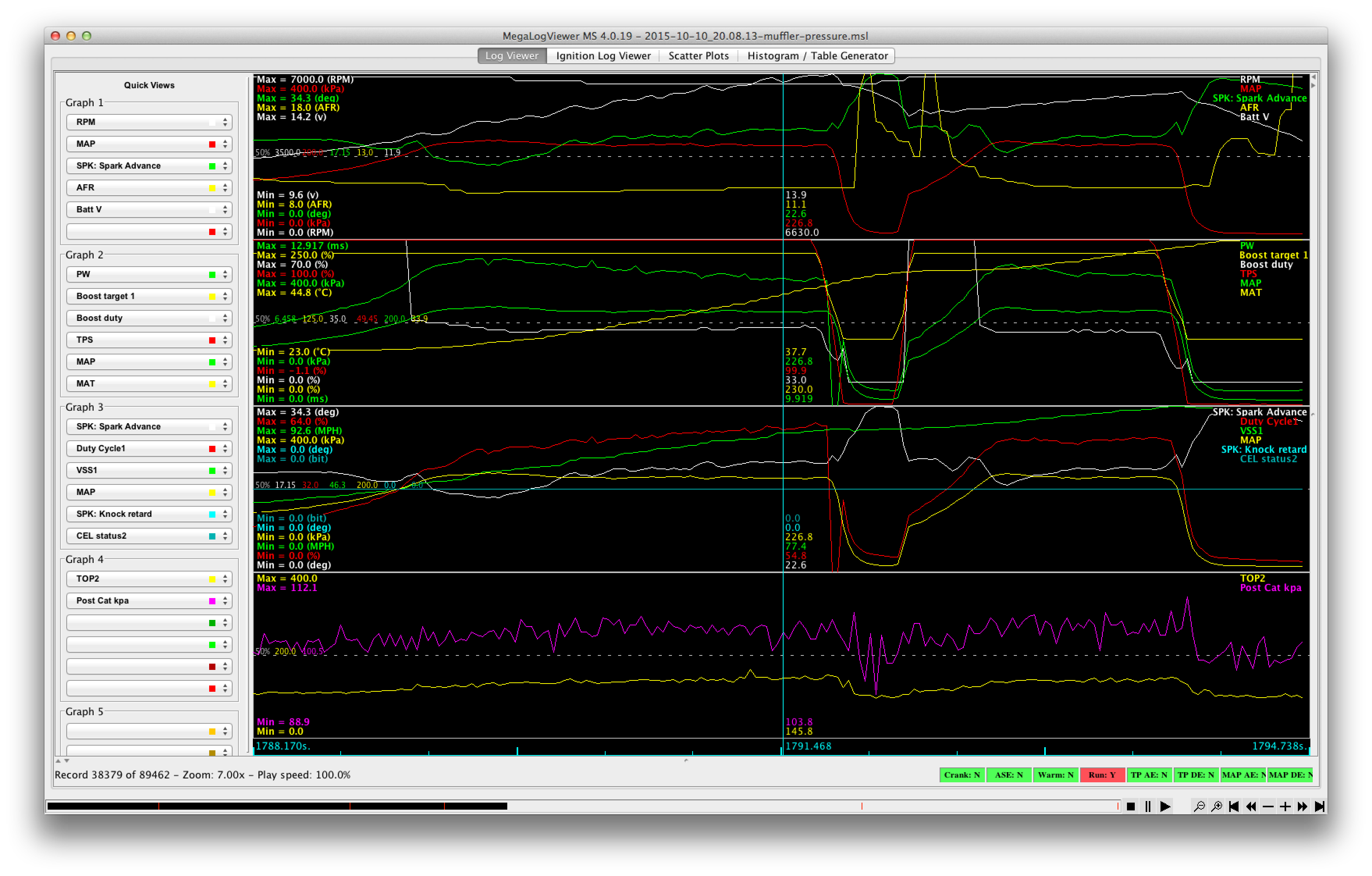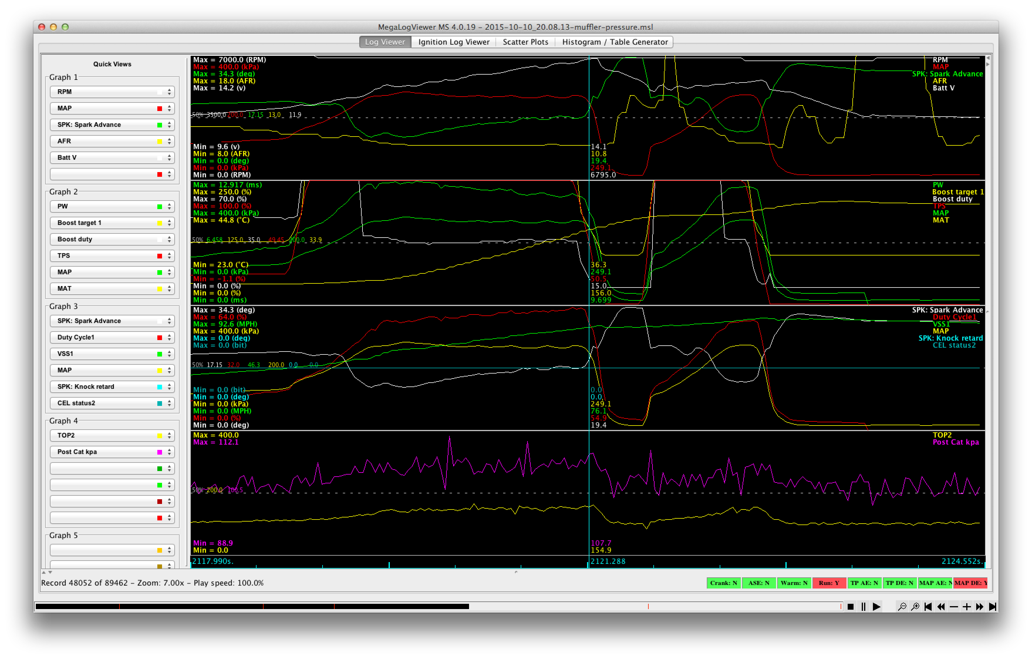 We used two pressure sensors, one post-turbine (in the O2 bung that's available for narrowband use) and one pre-muffler. There's no O2 sensor bung after the cat, so we ran the copper tubing up the tailpipe, through the muffler, and out into the midpipe. Bend the end over 90 degrees so it's not acting like a pitot tube, put a length of silicone tubing on the end, and route it into the cabin through the trunk. Hook it up to the MS3, go out and do a 270 kpa acceleration run and we got this: