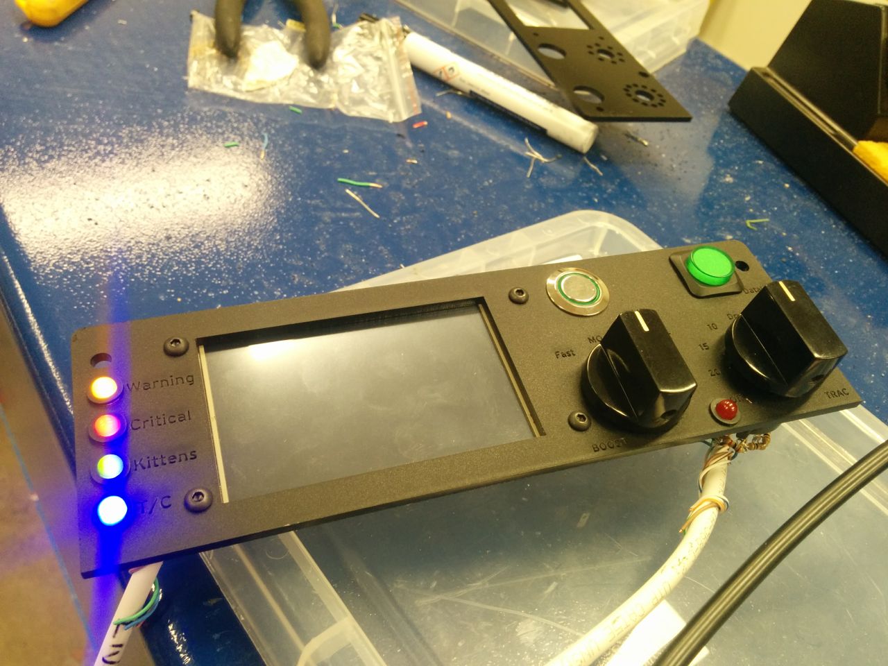 Status LEDs down the left-hand side, yellow and red for warning & critical alerts (Arduino will interpret CAN bus data to drive these). Green is unassigned, blue indicates the RaceLogic TC is active.