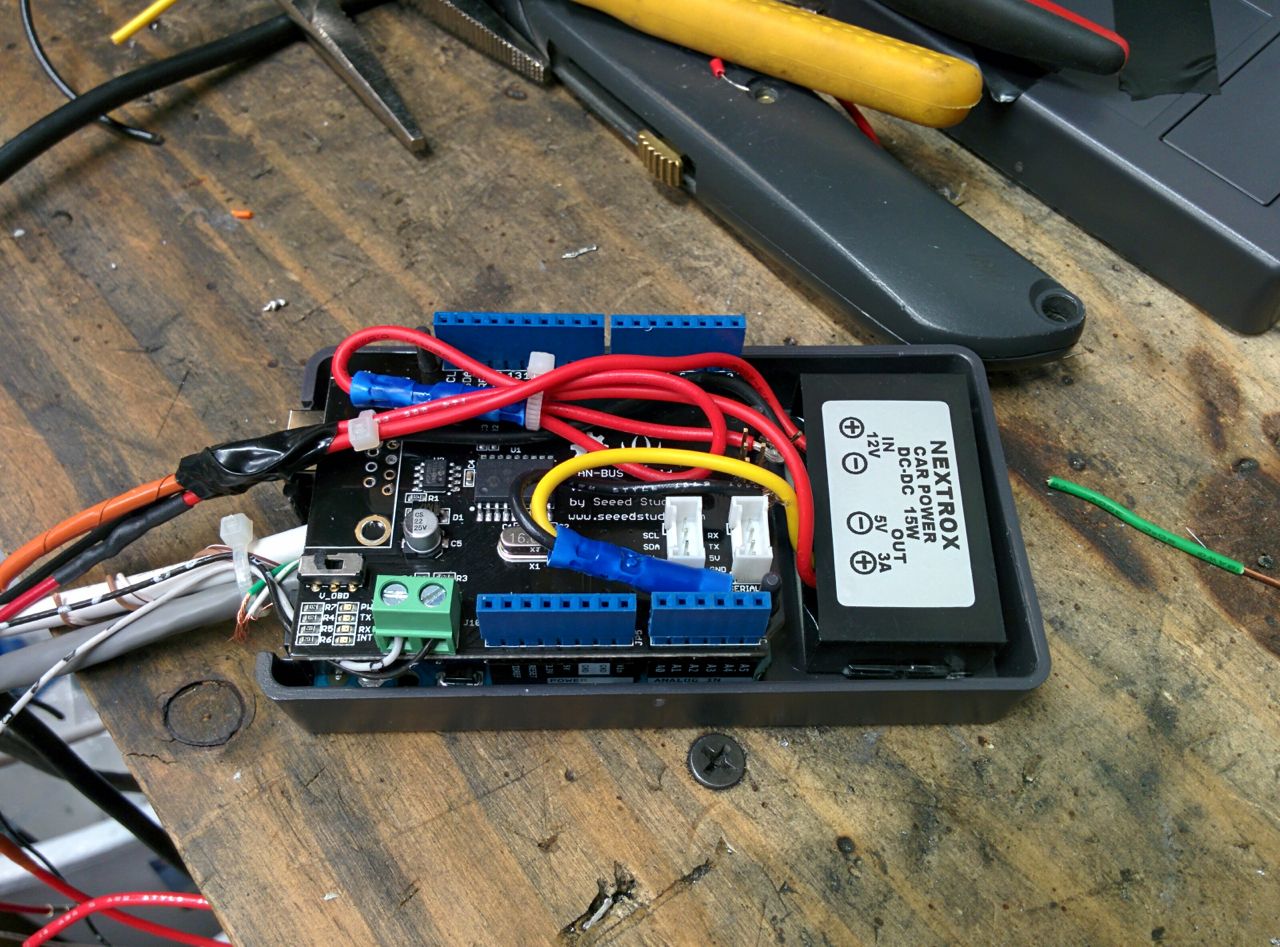 TK and I banged on the display some more the last couple of weeks, got it mostly wired up and working. It's an Arduino Uno with a Seeedstudio CAN bus shield, listening to the MS3's CAN bus broadcasts and talking to an LCD panel (not sure of the brand -- Chris found it) over a serial port. The power supply is a cheap switching 5v supply intended for charging phones and the like.