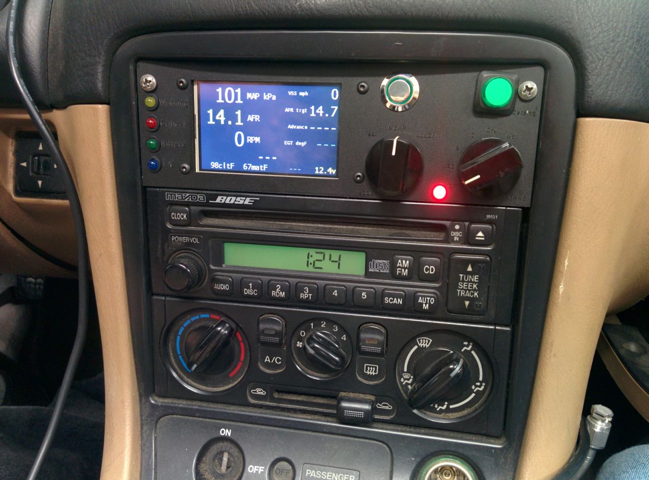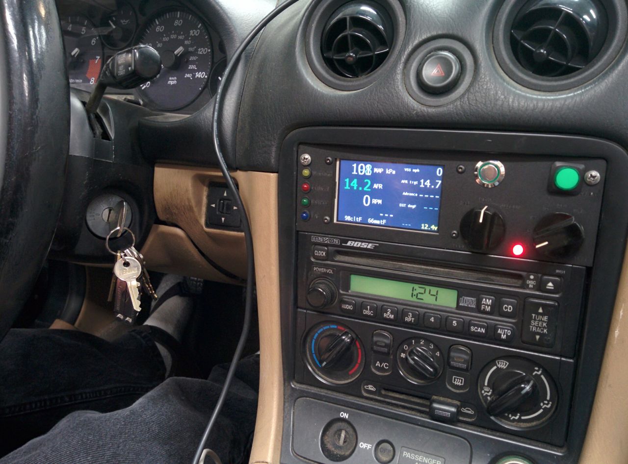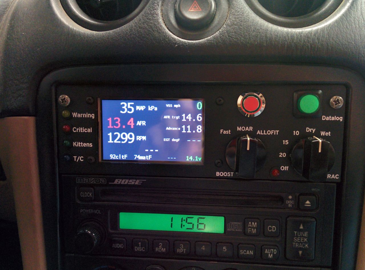Right now the software isn't doing anything with the LEDs on the left, and the traction active LED isn't wired up to the Racelogic yet. The button on the top right is loose -- it wound up being too close to the bracket that the panel screws to. (These are basically pieces of aluminum stock bolted to the vertical uprights in the center stack, bent over at the front and drilled for screws. It's what used to hold the three analog gauges I had in there). Need to make another faceplate with the button moved over 5-10mm.