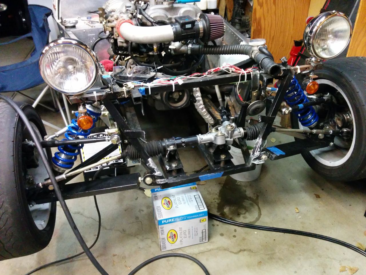 There's a BP6D in the background in many of those shots! Plus a Miata 6-speed, 3.9 Torsen, halfshafts, uprights, hubs, brakes, wheels, factory '01 computer, hacked-up wiring harness, fuel pump, and, uh... OK, I guess that's about it. Like an Exocet but without the subframes or the A-arms.