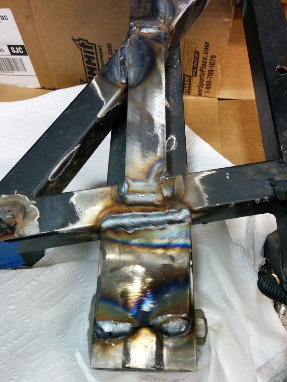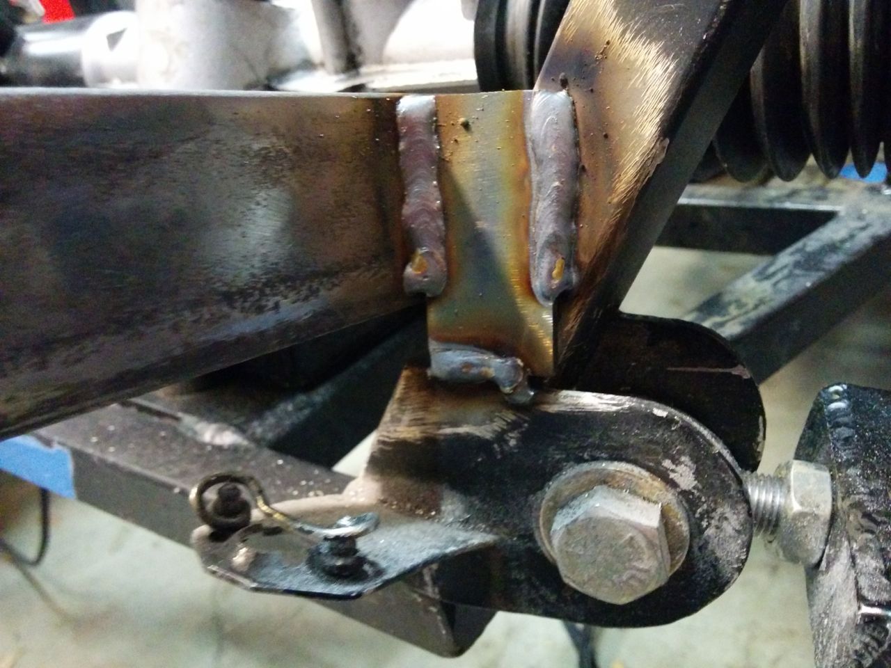 So I did some work on the Seven this weekend instead. The guy who built it did a few things that I find somewhat questionable, and I'm slowly working on fixing those. The fuel system was a nightmare (mostly fixed now by replacing literally every component except the tank, the pump, and the injectors), but the cooling system had some issues as well. Sevens have a narrow nose, so most conventional car radiators don't fit. There are a few standard car radiators that are about the right size, the builder had used one that I think is out of an early-80s BMW of some kind. The core is roughly 15 inches square, with plastic side tanks, and it's a dual-pass because both hose ports are on the same side. There are a few problems with it -- it's very beat-up and he appears to have mounted it to the chassis using the fan bolts. One of the threaded holes had stripped and has an epoxied-on nut to repair it. Worst of all, the fill cap leaks and appears to have been RTV-ed on in an attempt to fix the leak. http://www.codrus.com/locost/rad/seven-rad18.jpg Since I'm not totally sure what car this rad came from and don't feel like spending hours scouring junkyards looking for one, I decided to go with one from an early-90s Honda Civic. They're dirt cheap, I picked up an aluminum one from Amazon Prime (free shipping!) for $50. http://www.codrus.com/locost/rad/seven-rad10.jpg (The bent fins are from stupidly taking the cardboard off before test-fitting it. They were straight when it arrived) Not sure if the fan he used was from the donor Miata or not, but it fits the Civic rad nicely. http://www.codrus.com/locost/rad/seven-rad11.jpg The Civic radiator uses post mounts like the Miata, and needs mounting bushings. I didn't have any extra of those, and nobody keeps them in stock. I did find a few generic "donut" bushings, and combining those with a large rubber vacuum cap made for a workable bushing. http://www.codrus.com/locost/rad/seven-rad12.jpg The core is about the same size, but it's top/bottom tank so it's taller and narrower than the BMW (?) one. The lower hose outlet wants to occupy the same space as the steering rack mount, so to clear that and also fit inside the nose it needs to be angled slightly. So, tear the front of the car down and we've got this. Yes, the wiring at the front is a huge tangled mess -- cleaning that up is on the list of Seven-related projects. http://www.codrus.com/locost/rad/seven-rad01.jpg Some 1" angle iron welded on with holes in the bottom for the bushings. My welding still sucks. :) http://www.codrus.com/locost/rad/seven-rad03.jpg And the bottom mount mounts are done! If the brackets look like they're mounted at different angles then that's because they are, but it's what's required to center the rad in the chassis. I'm not sure if that's because the chassis isn't symmetric (well, I know it's not, but I don't know if it's off that badly) or if the two bottom posts on the rad are in different locations. http://www.codrus.com/locost/rad/seven-rad13.jpg The top mount is trickier, because there's no structure that high in the front of the nose to attach it to. So I added a piece of angle across the nose: http://www.codrus.com/locost/rad/seven-rad07.jpg It's amazing how much ugliness can you can hide by painting the welds black. :) http://www.codrus.com/locost/rad/seven-rad14.jpg And then a massively-overengineered top bracket. More angle, a couple of bent pieces of flat, and some holes with welded nuts on the cross-angle: http://www.codrus.com/locost/rad/seven-rad15.jpg http://www.codrus.com/locost/rad/seven-rad16.jpg Another problem with the car is that the front suspension upper mounts are kind of stuck out into space, cantilevered using a couple of pieces of small angle iron: http://www.codrus.com/locost/wishbon...bone-front.jpg http://www.codrus.com/locost/wishbone/wishbone-top.jpg TurboKitten simulated this in solidworks and it looks marginal on strength. Fortunately, it's pretty simple to reinforce. Another piece of angle connecting the main side rail with one of the diagonal tubes on the nose, and a triangulation piece for the top mount bracket itself: http://www.codrus.com/locost/rad/seven-rad06.jpg The original builder had put in generic corrugated hose top and bottom, which wind up in the wrong locations for the new radiator. For the bottom, an old Miata lower radiator hose, trimmed at both ends does a good job of connecting to the corrugated hose. For the top, I had a silicone Miata lower radiator hose lying around. FM makes these, they're supposed to improve clearance around the intercooler tubes. It never really fit in my car, so it just sat on the shelf, but it's damn near a perfect fit as an upper hose on the Seven. So the mechanical bits are all done and it fits in the car. Now I just need to find a coupler for the bottom hose and then fill it with coolant and see how badly a $50 radiator leaks. :) --Ian |