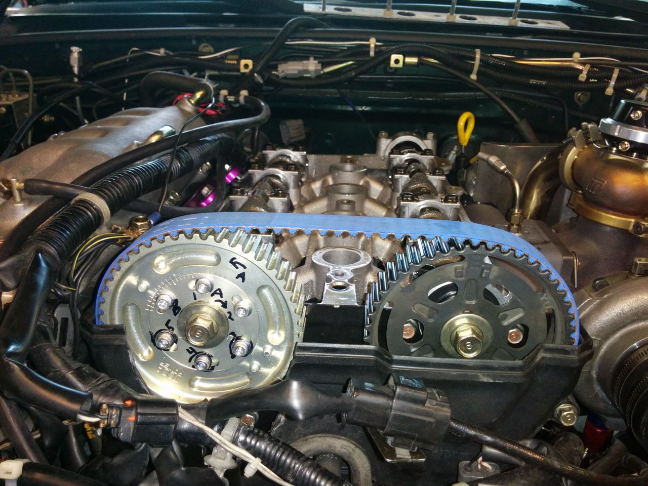 So when I built the engine, I put in a BP5A cam and a Toda adjustable cam gear. Since I'm going to the dyno on Wednesday, it seemed to make sense to try to get some data on the cam gear before going there, and also to figure out how to adjust it in a relatively quick fashion -- don't want to burn dyno time turning wrenches any more than necessary.