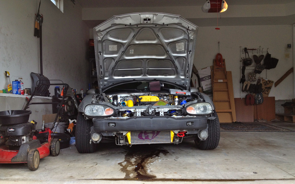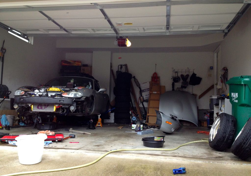 If you guys remember from a while back, I put a crack in my oilpan, and I JBWelded it up. It held up for a couple months, but it started to leak again. So I have let the car sit in the garage for a couple weeks, waiting for it to warm up so I can change the oil pan. Since I'm going to be pulling the motor anyways, figured I should someother ---- while I'm at it. Current status of the car: