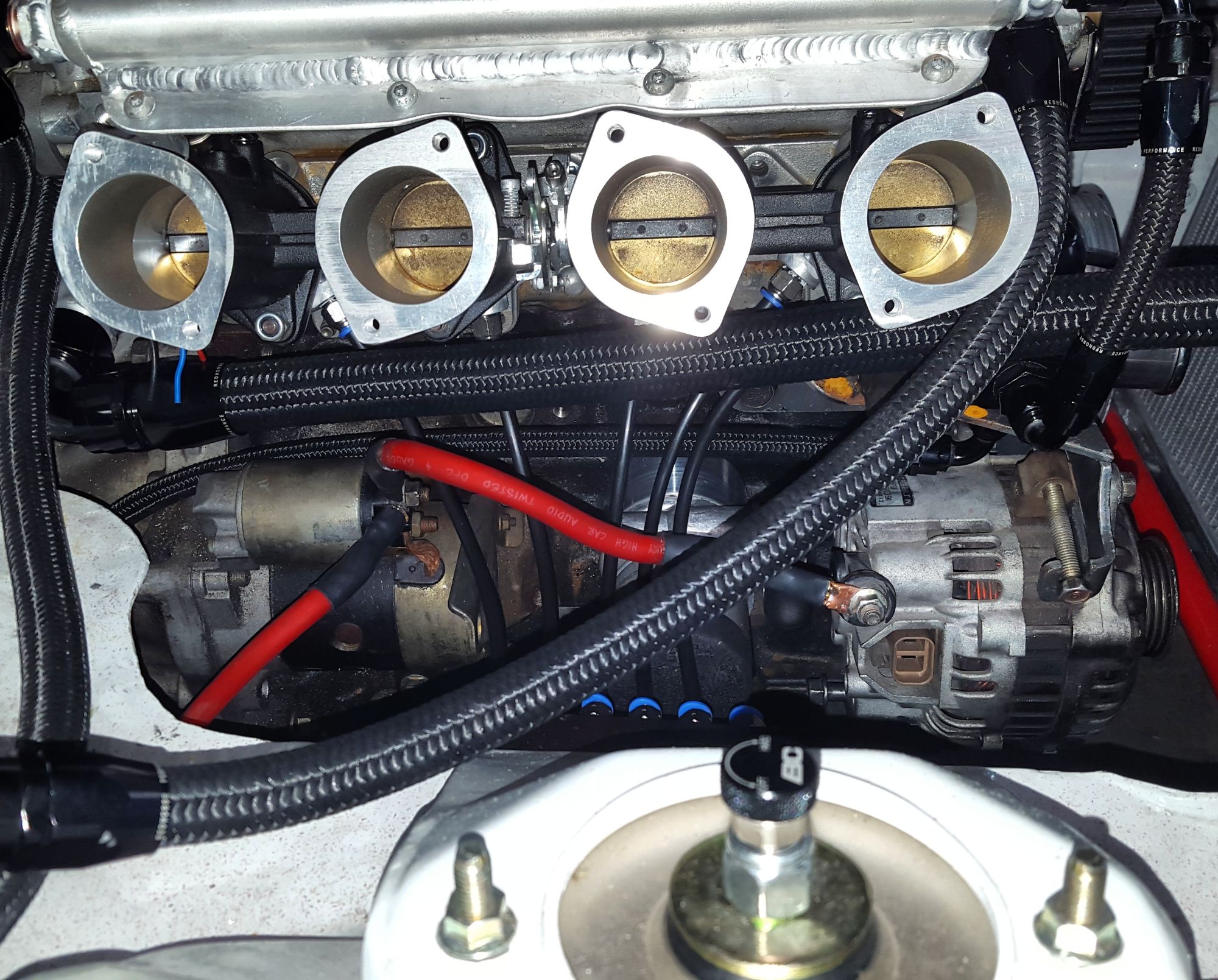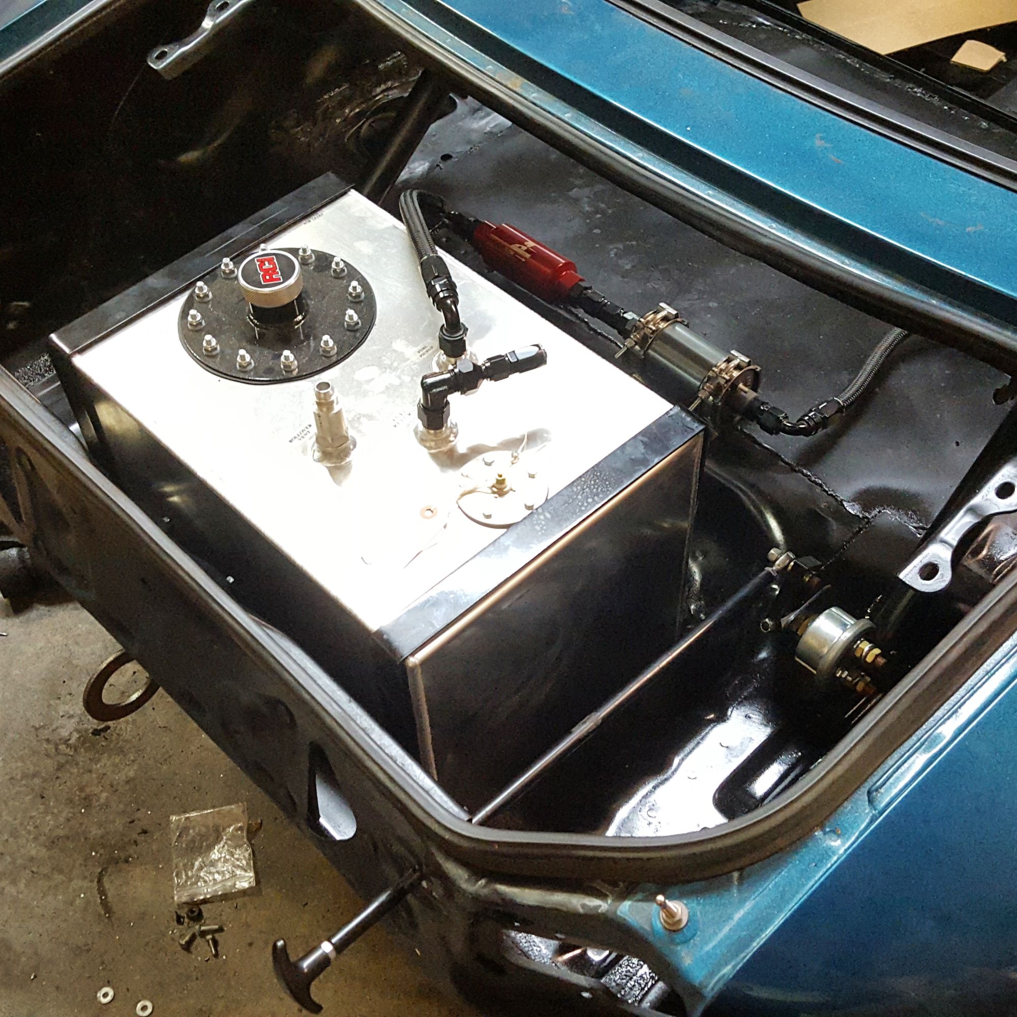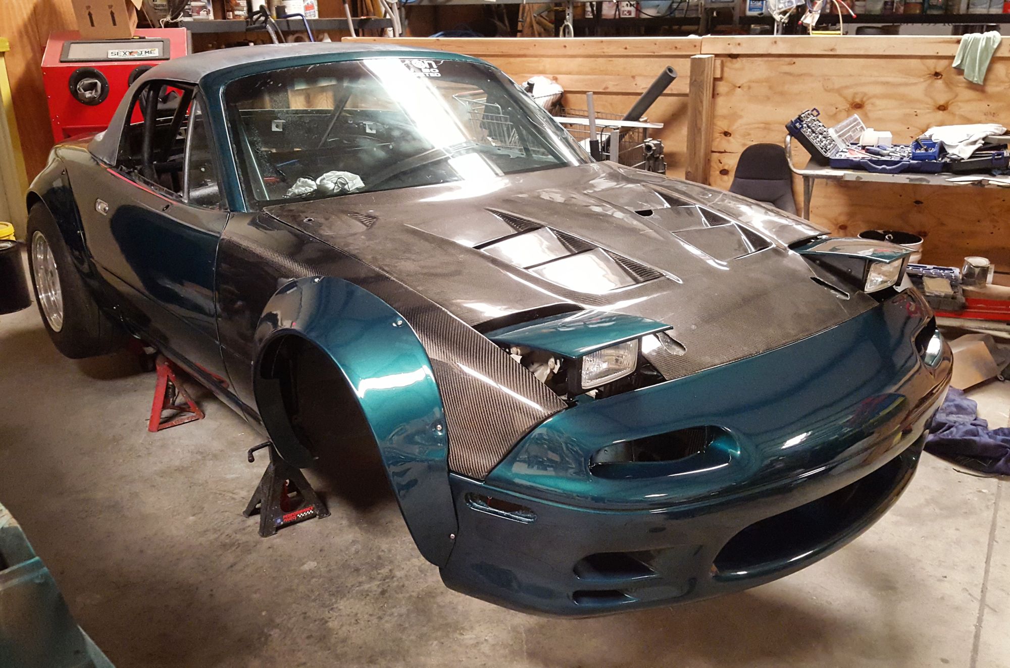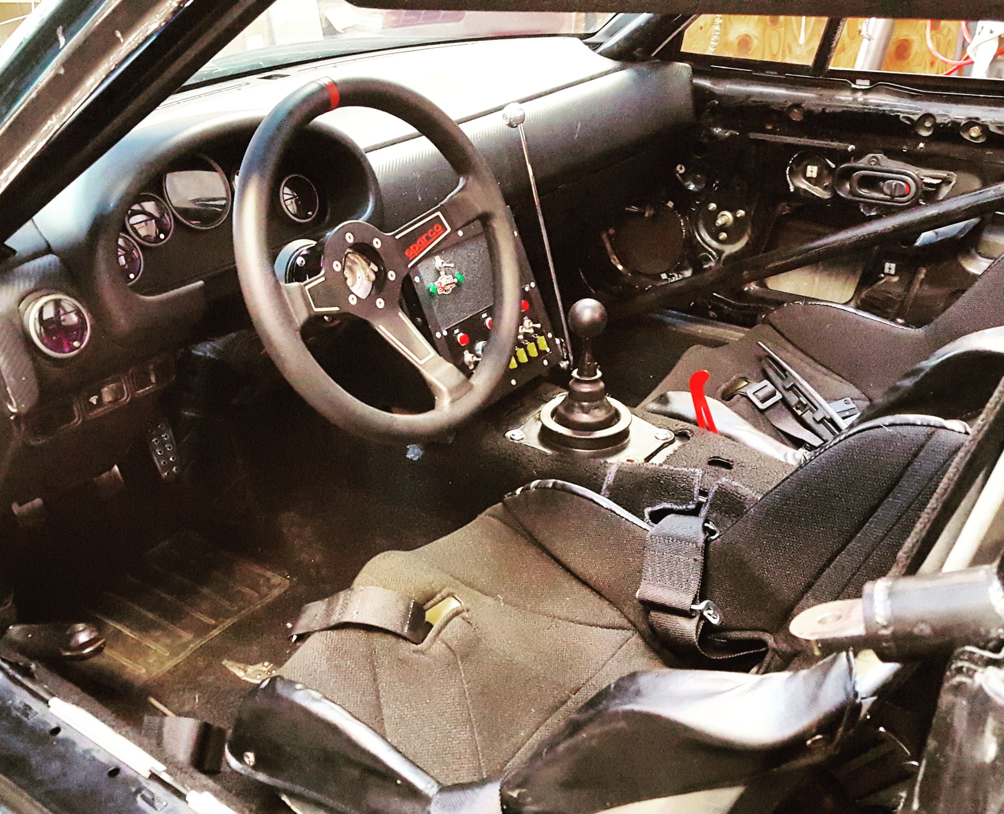 well damn its been awhile since ive updated, all the pictures I shared over from facebook are all missing. ugh, well heres some recent pictures. new things, full chomolly 8.50 cert drag cage w/ a pair of kirkey prodrag seats, guage cluster mocked up, ran fuel lines, and I decided to run e85 and make maybe more power than earlier anticipated. got a pte6262 and tial 44mm ewg and then I had to enlarge the fuel system a little , -8 feed/ -6 return and picked up a set of fic1650s. got my carbon Miata cf taillight panel, relocated my oil cooler stacked behind the ic, ran vacuum lines and started on the parachute stuff. next on the list is wiring.
