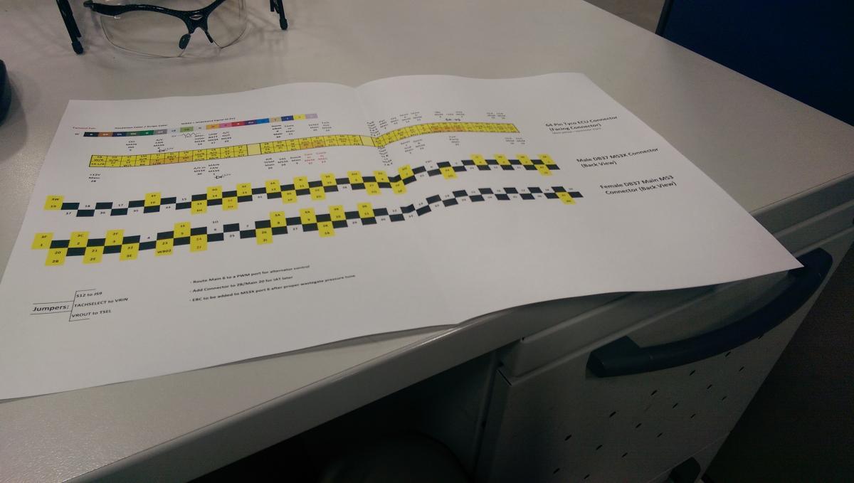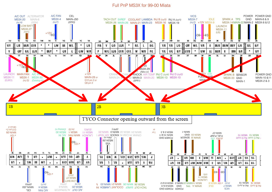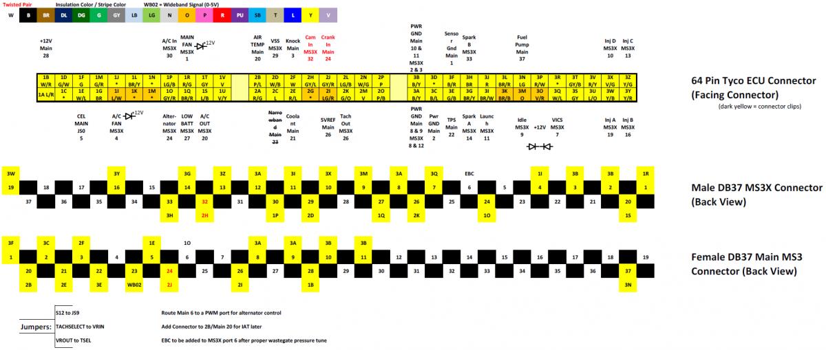 As I said above, I will be resoldering my db37 to tyco adapter in the next day or two. To avoid any connector confusion, I have made myself an idiot proof layout, so I can make sure that things are done properly this time, and now have the added benefit of making the diagram myself so I understand how it was designed and can read it properly. The ECU is done as the tyco connector itself, not the individual plugs, and is show EXACTLY as it will be layed out on the connector.