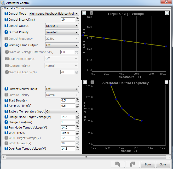 Bigger problem that put a hault to my tuning attempts for the evening: alternator control. I am using the newest firmware with the added support, and must just be wiring things improperly. Here's a screenshot of the settings just incase their incorrect. I've wired and configured it as shown below.