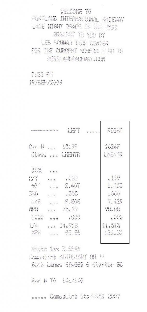 Ran tonight at Portland International Raceway and had a great time. That track is so much better than Pacific Raceways that we have up here in Washington. I also got a chance to meet Jeff Ciesielski and Cueball from the forum today as well. Anyways, here's the numbers, 11.5 @ 121 was the best pass tonight. Will post up a slip sometime tomorrow.