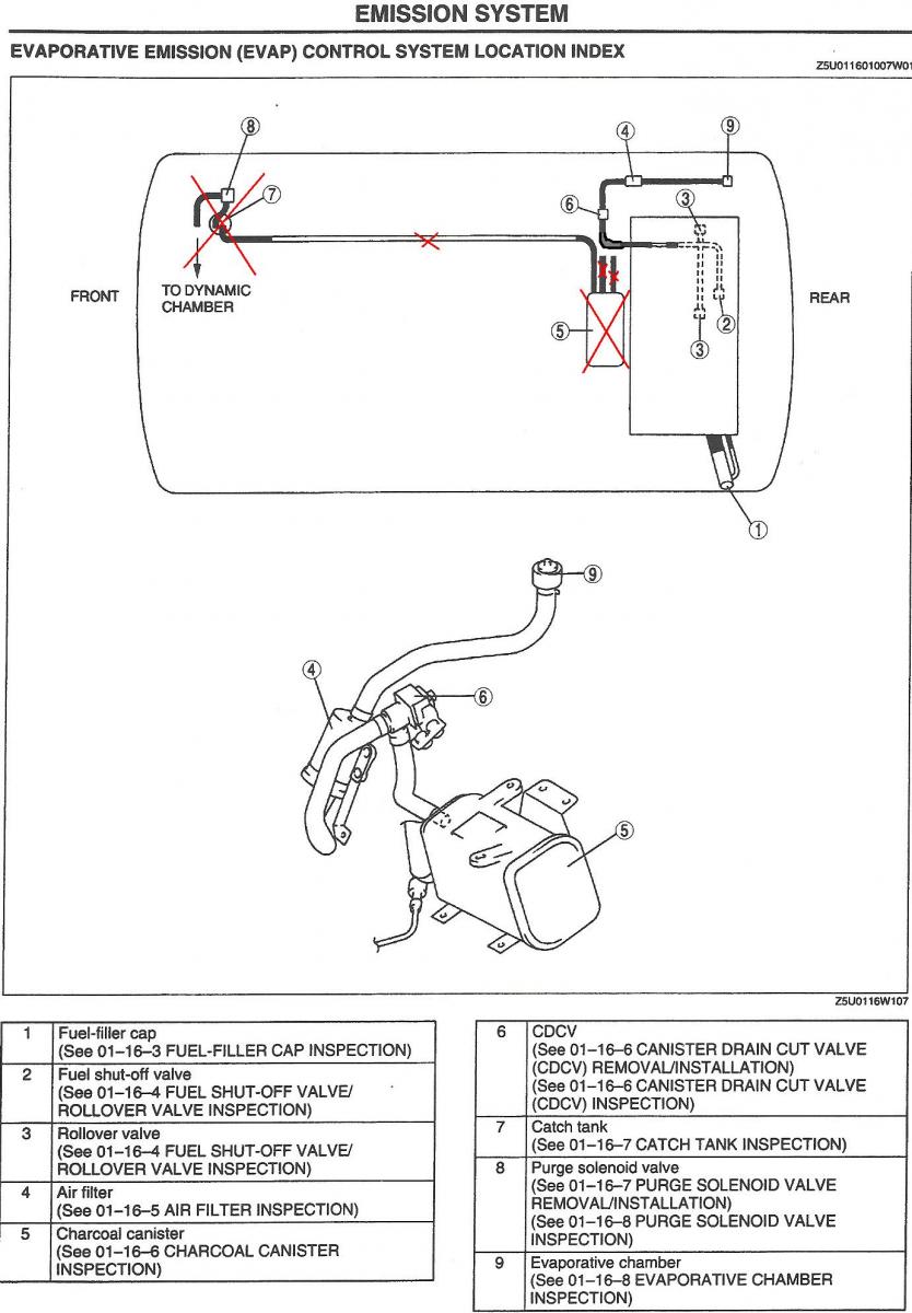 On the charcoal canister there is a line that comes from the fuel tank. If I eliminate the charcoal canister, what do I do with this line? There's another line going from the charcoal canister that goes to the CDCV, then to an air filter and finally the evaporative chamber. If the canister's gone, then these can all go as well.