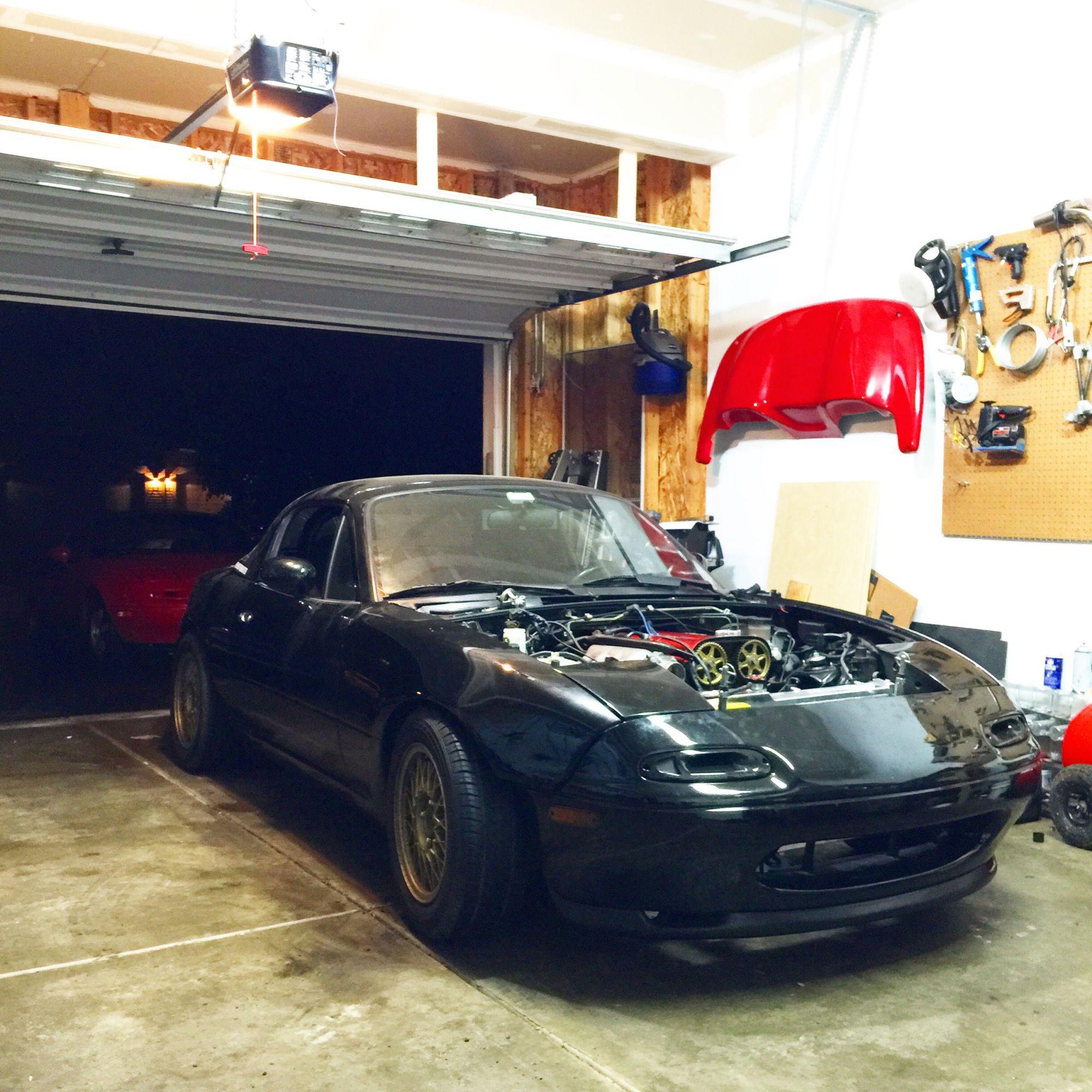 crashed the front end like a dumbass. massaged the hood back into place, sourced a smurf blue nose from isellmiataparts.com's local warehouse.