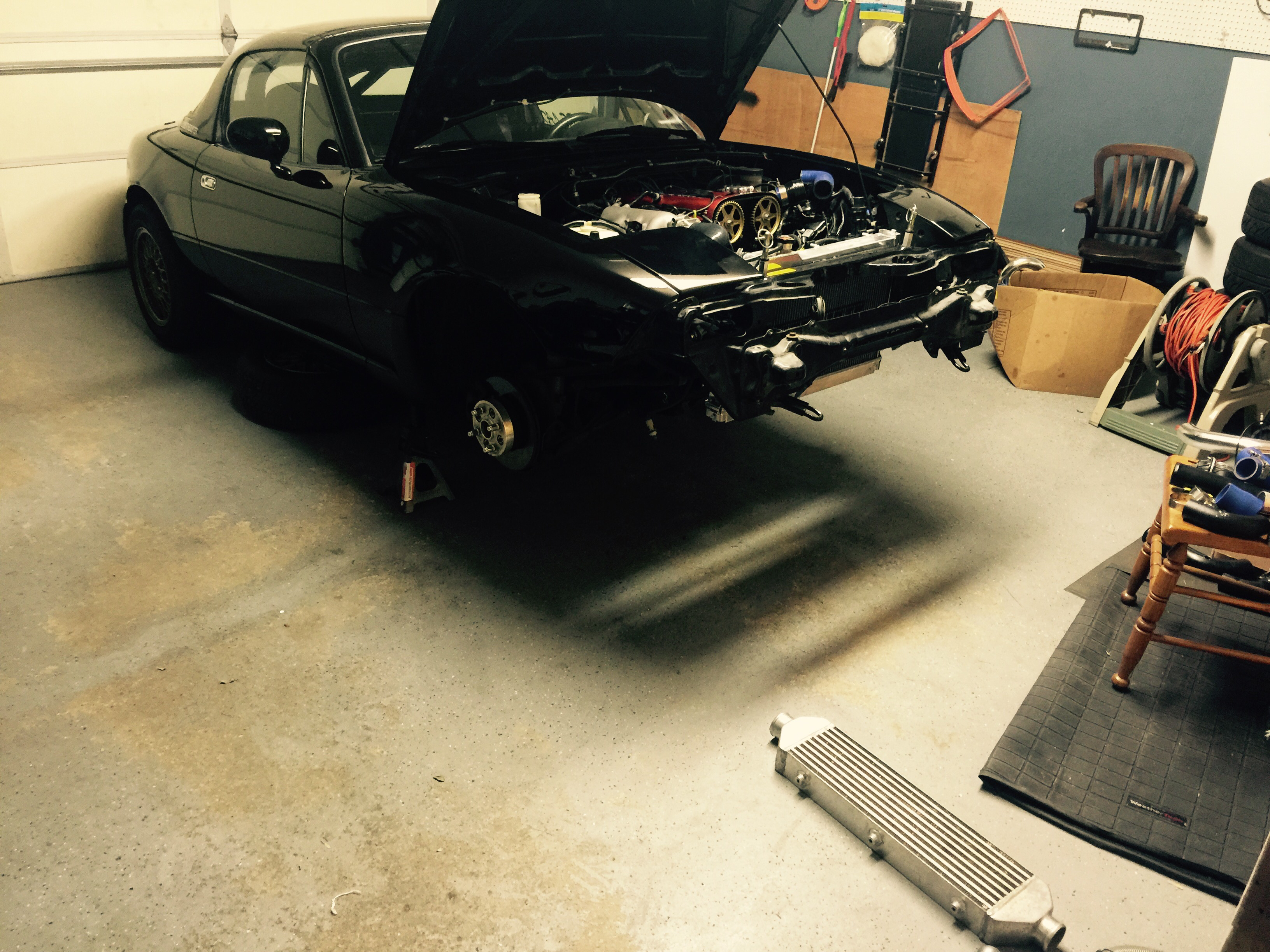 Adam (flying_solo) and I met up with Aaron (dieselmiata) at his garage. He already had my car up on jackstands, ready for the motor pull.