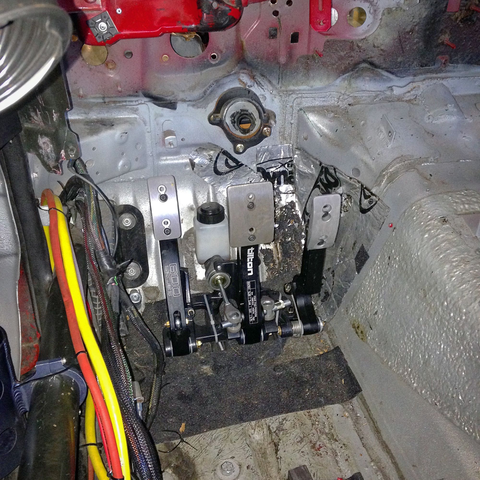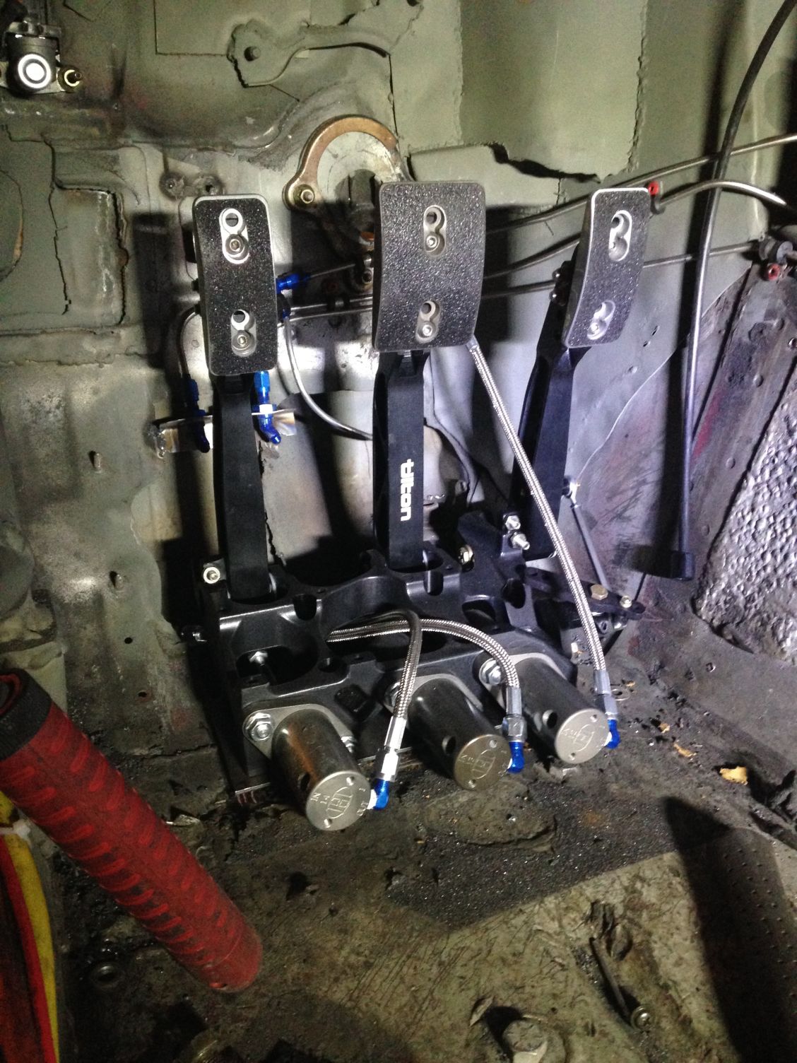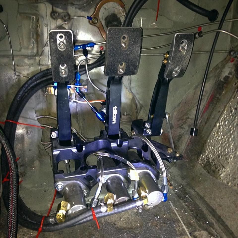 pedals are in. and plumbed. i still need to make a false floor for them.