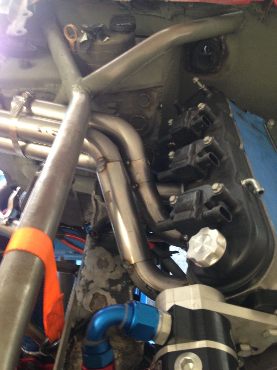 up swept headers.mmmmmm i had to ditch my holley valve covers and go back to stock. i'll also need ASA plug wires to run around the headers.