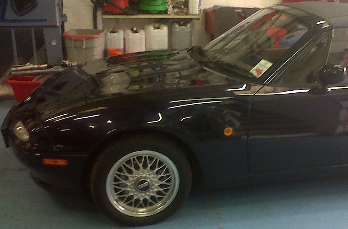 After much Mazda Miata colour internet geekery, I've narrowed the colour down to one of the following: Stormy Blue, Strato Blue, or Twilight Blue. Either way it's strange, because according to everything I've ever read, Mazda didn't do a blue/purple NA.
