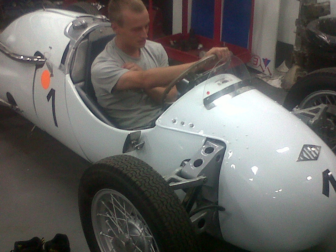 More photos: First, this is me in a 1950s Kieft Formula 3 car, as raced by Stirling Moss no less! Complete with his signature on the dash. Very cool. The shop have just finished rebuilding it. More info about these cars here: http://www.localhistory.scit.wlv.ac....Cars/Kieft.htm