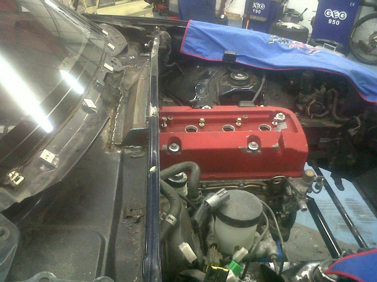 This is how the engine will sit in the car. Obviously there's a lot more work still to do here. NB: Oil filler is easily accessible, and the cam cover can be removed by unbolting the subframe and steering rack and dropping the engine slightly. Hassle... but not too big a deal I don't think.
