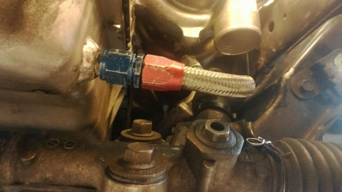 New oil drain line completed. It's tight with the steering rack, compressor outlet pipe and all, but will work.