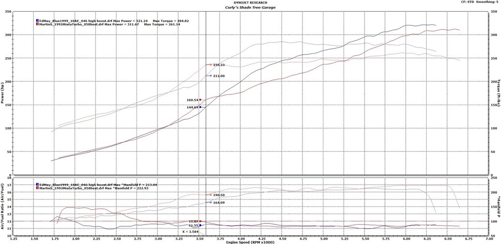 Now that Laz is making ~310hp, I can compare it to Ed's 10ae/msm/vvt/absurdflow car that makes 320.
