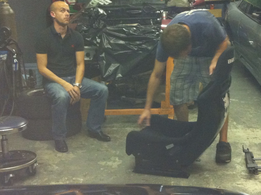 To the the right is my 12 pound tank of an old seat rail. To the left is Ryans prototype rail that is in my car now. The damn thing cant weigh more than 2 pounds total and that seems like a lot. Its sturdy, seat width adjustable and dual locking but not quite finished yet. So far though, I love it. These should be in production very soon and will be well worth it.