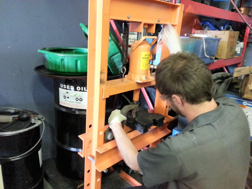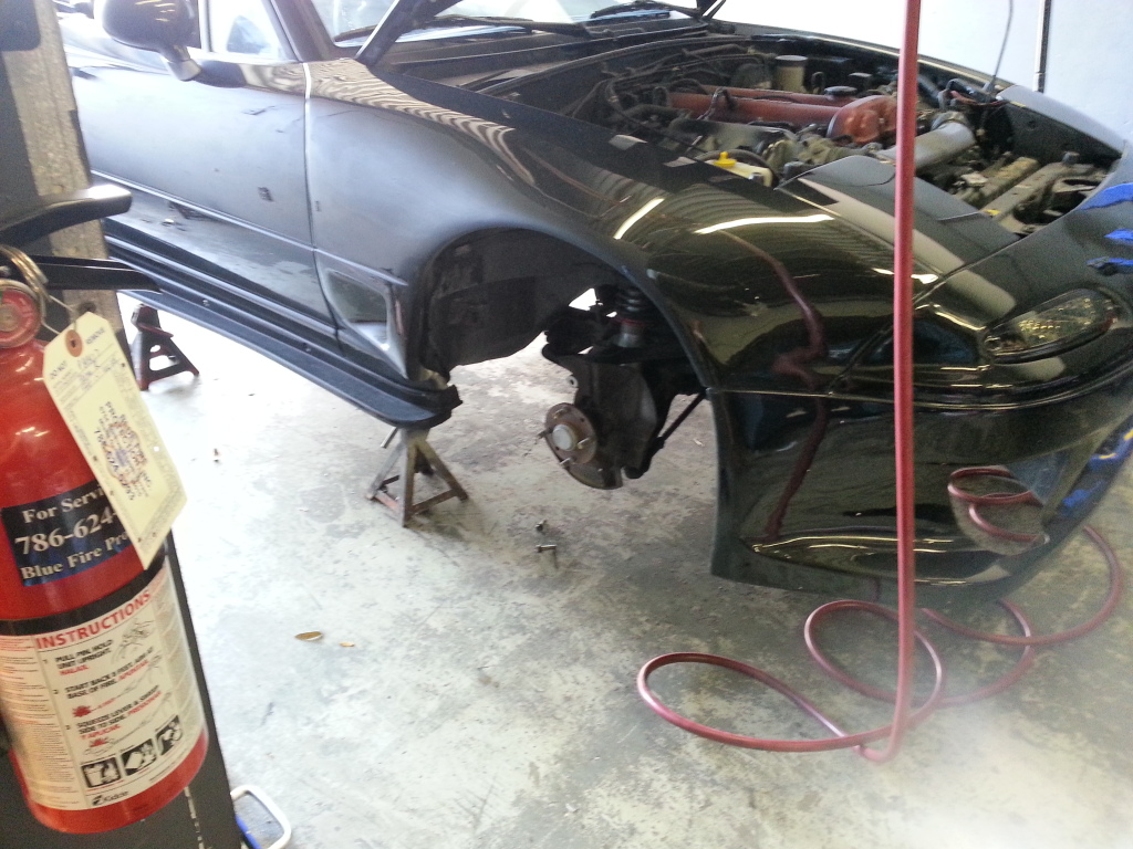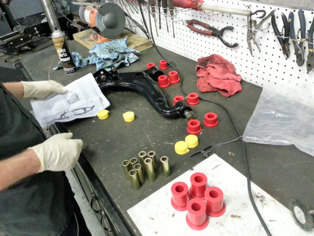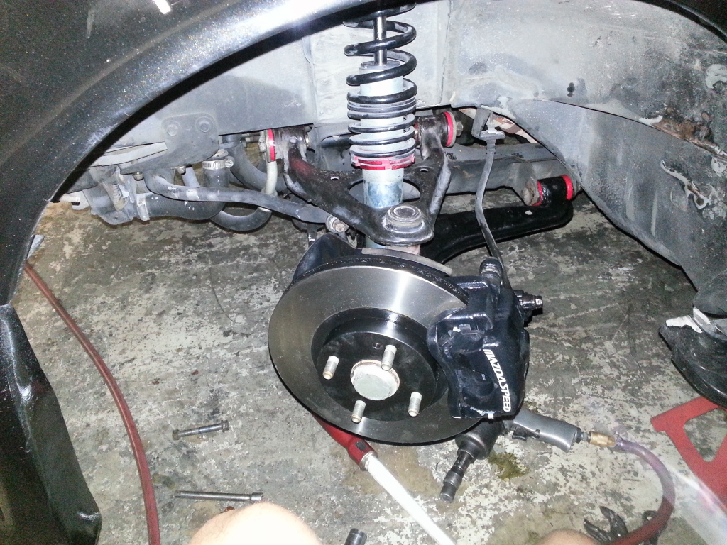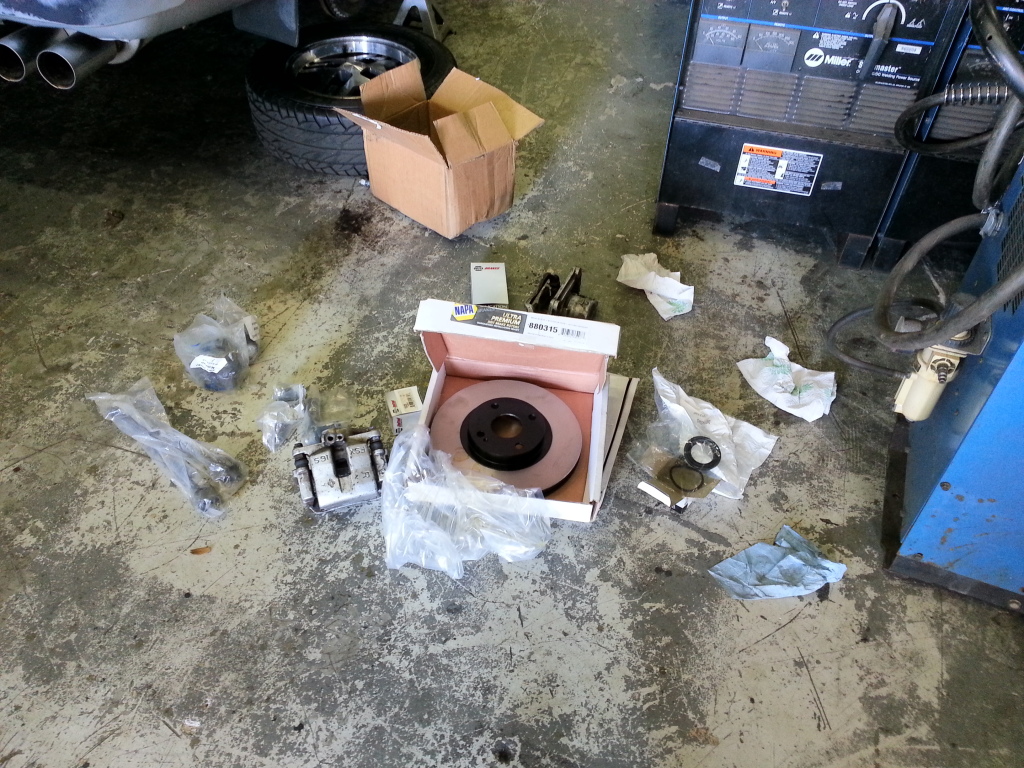 I guess its time for an update or two. Ryan Kaufman and I had a rather hellacious day working on my pile. We rebuilt the MSM calipers, put on the NAPA rotors, Ryan installed the poly bushings in the front, pretty much all of the control arms have been replaced because they were all bent, the read brake pads were changed and now I need to get SS brake lines, a new master cylinder and a few other things. The ball joints were replaced and as we were trying to replace the tie rods, we realized that I was sent the wrong ones that were a mm too thick so now I have to rectify that. Already the car feels loads better driving it this morning.