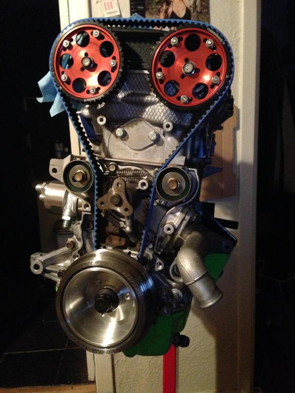 Since it's too late at night to go find alumiweld locally, we kept chugging along on the motor. We timed it and put a gates timing belt (blue) on it. I got a 12+1 trigger wheel for my SuperMiata damper, torqued to spec then installed it as well. Gawd the motor is looking sexy.