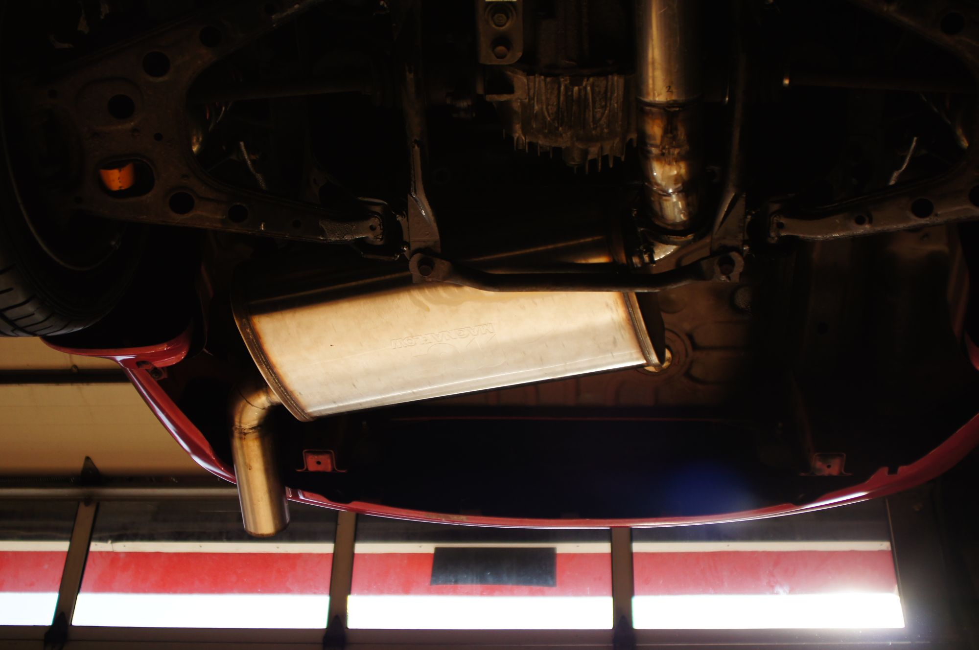 You can see that the outlet did not need to be trimmed flush with the muffler. If I had to do it again, I would move the muffler closer to the tail pipe to allow more clearance around the subframe on the inlet side.