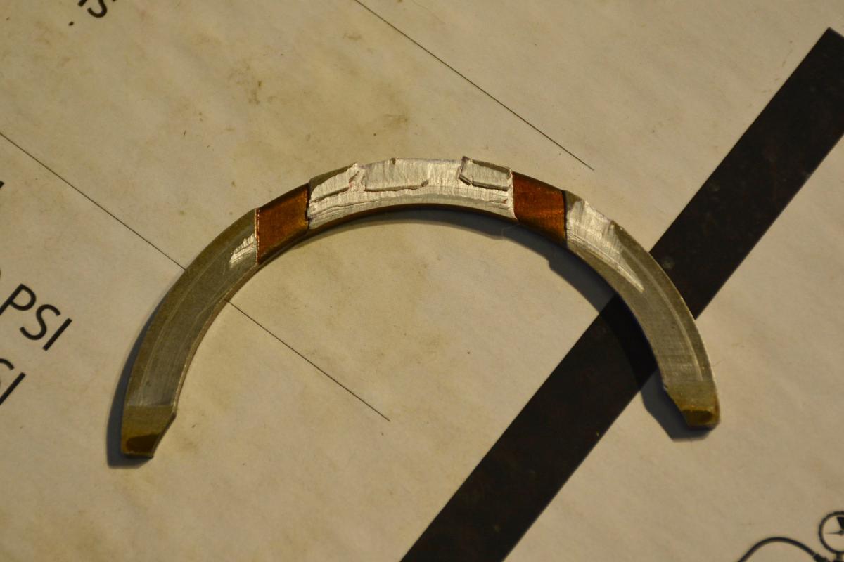 Whilst installing the #3 oil squirter I noticed something that looked like aluminum foil stuck to the side of the cylinder wall in cylinder #3. Sure enough it was a nice shaving of aluminum. After wondering wtf (where the eff) did that come from, I noticed the thrust bearing had been fubar'd by my incessant installing and removing of the crankshaft.