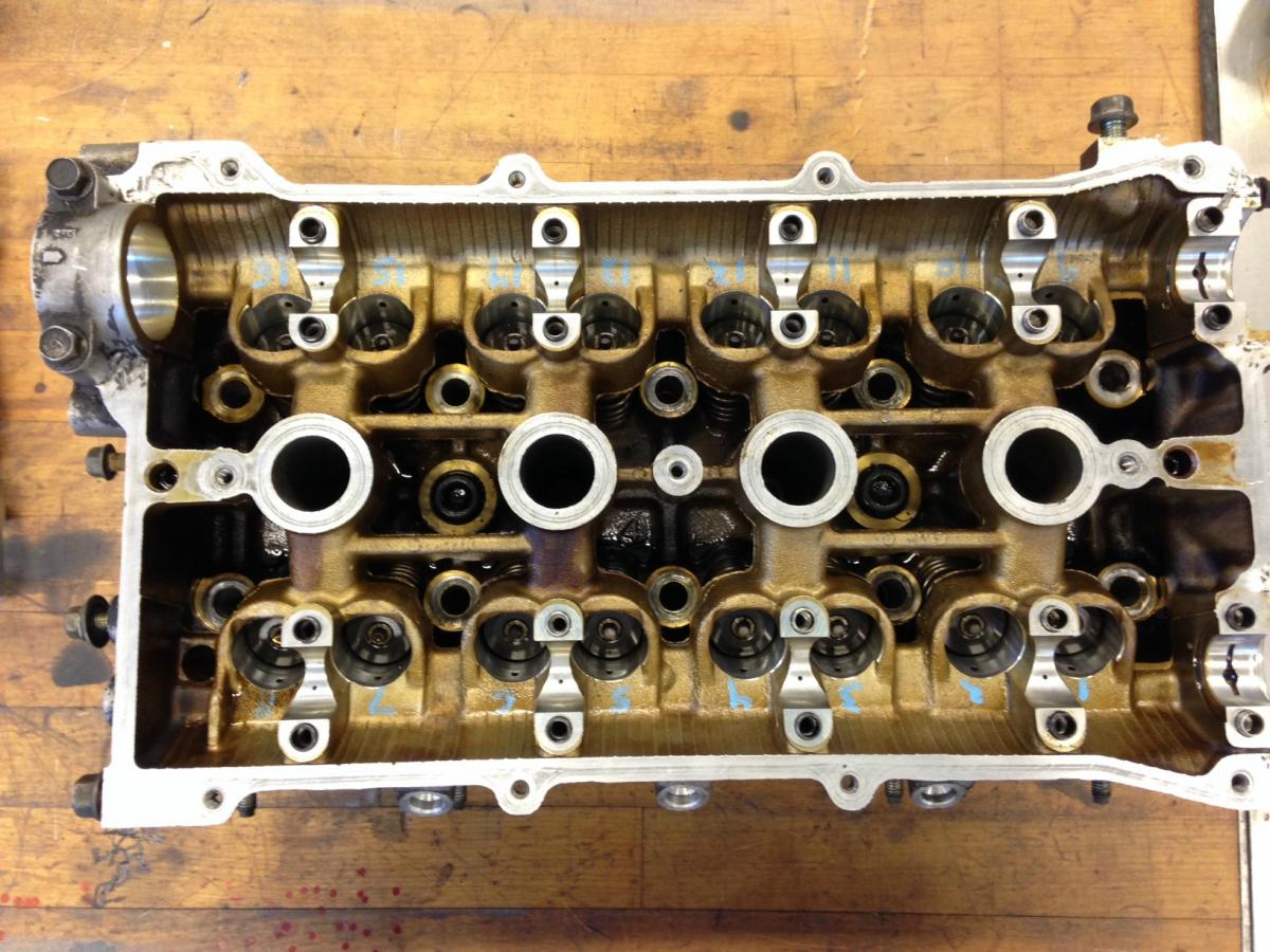 On to cylinder head disassembly, I numbered each valve individually, so I can keep all the valve cotters, retainers, etc. all together and put them back in the same spots. 1-8 are intake side, front to back. 9-16 are exhaust, also front to back.