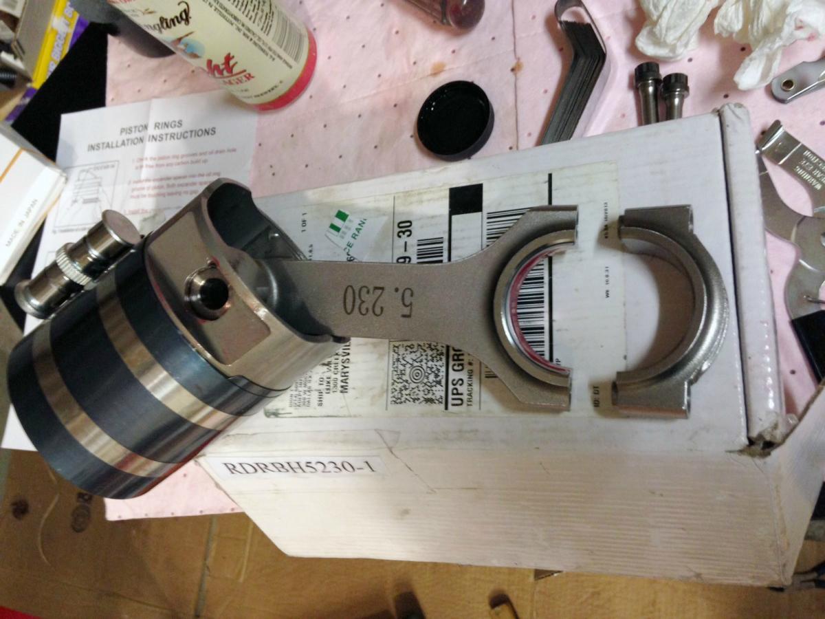 Here's cylinder 1 piston/rod assembly ready for install. The piston ring compressor I bought is generally terrible, I would not recommend it. I learned how to use it better after cylinder one, ie don't do it like it's pictured, have the ring compressor go all they way to the bottom of the skirt.