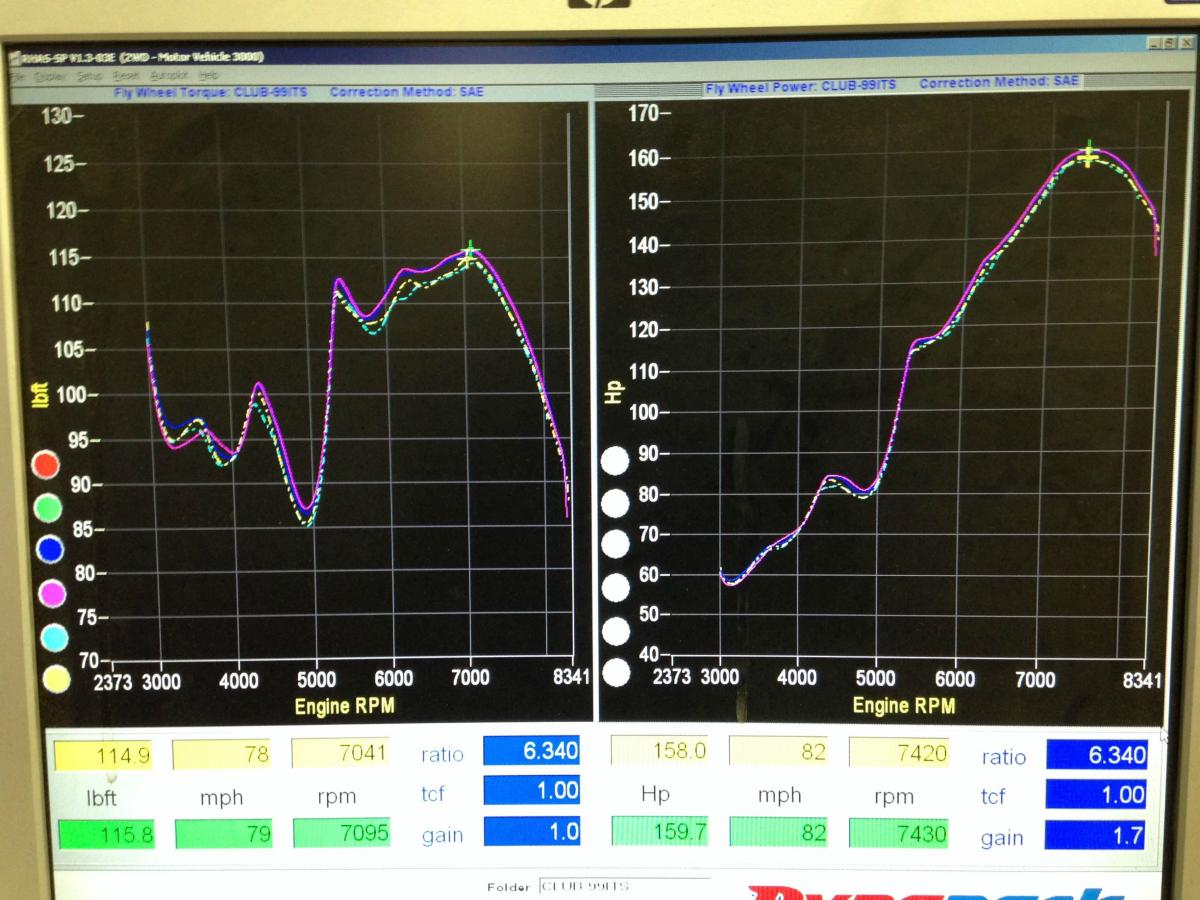 And real dyno screen grabs, the two sets of lines show the first couple pulls I did with the OTS hondata b16 tune, and the final tune I am using. Unfortunately it's really difficult to read because all of the lines are dotted, and all of them are the same colors. Uh...yea