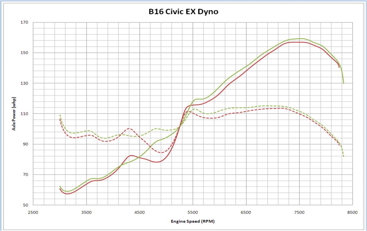 So I excel'd the data outputs from Dynapack to make that sh*t moah readable. Green is the final tune on the car, with the VTEC point set at 5200rpm. Red is one of the earlier runs, mostly OTS Hondata b16 tune with a 3800rpm VTEC switch-over. Solid lines are the horsepowers, dotted is the (not) torquez.