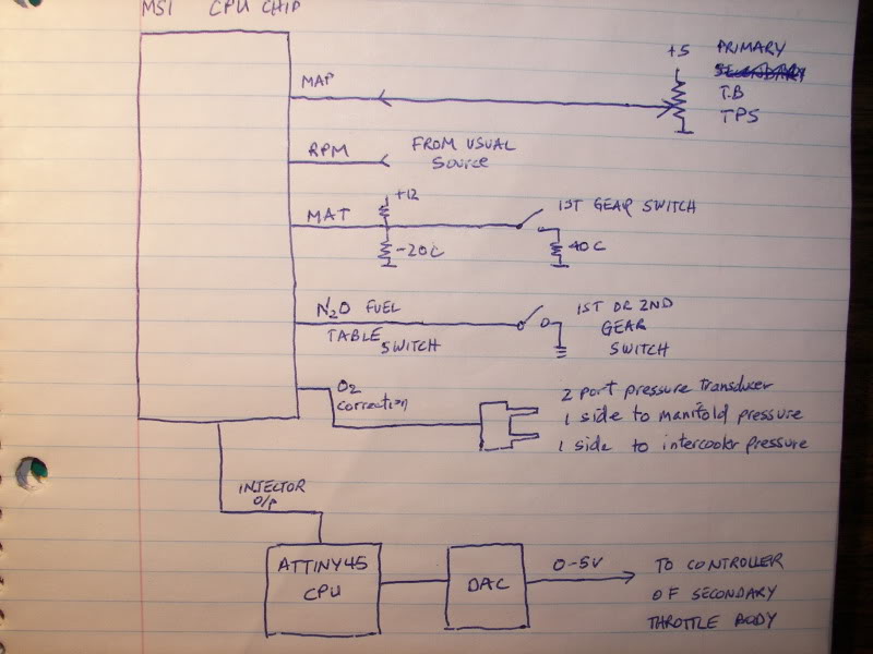 In addition, I have a 2 port pressure transducer, tied into the o2 correction input on the Megasquirt. If I set the O2 switch voltage, to the same voltage which is normally output from the 2 port pressure transducer at lets say 1psi difference, then the megasquirt will vary the throttle position (injector pulsewidth) until it gets this 1psi difference. This will allow me to easily tune the different points in the VE map, and allow the unit to correct while at part throttle, even if the targets are way off.