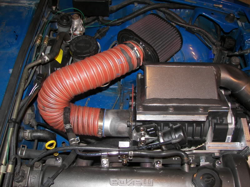 So I had it welded, put it back on the car, and then found that I was getting less boost, than my M90!!! The MP90 worked better above 5000rpm, but below that, I was down on boost by a couple of psi. Since the MP90 has much tighter clearances than the M90, and I didn't have any boost leaks, I figured that the inlet manifold was somehow hurting things. It was much larger that the M90 setup, so I reasoned that maybe I needed something that would give higher flow speeds. I made what should have been a better inlet manifold with this in mind, but unfortunately it didn't change anything.