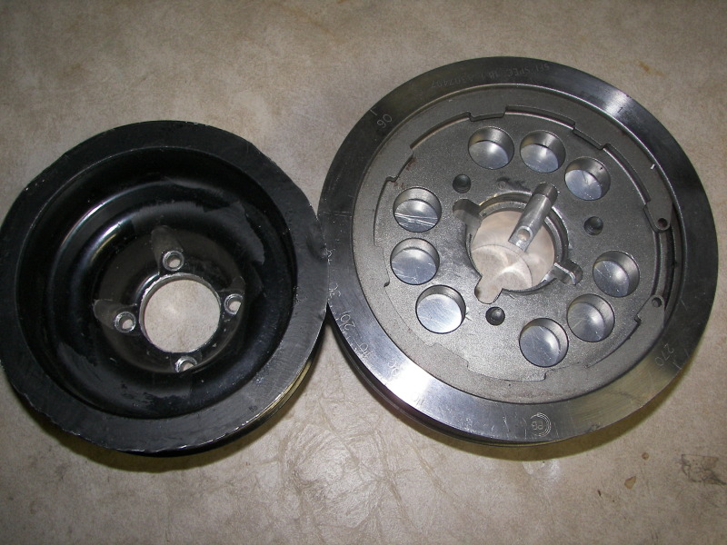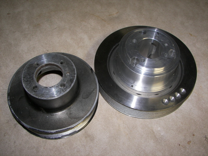 If I can't get the inlet to flow better at low rpm, then there is one other option. About a year ago, I picked up a Mustang pulley off ebay. I made a hub for it a few weeks ago. It's not nearly as elegant as my other pulley, and will be a bitch to put on, but should give me back the psi I lost at low rpm, plus make me a tiny bit more top end power. The small pulley measures 5.25", while the large measures 6.5"
