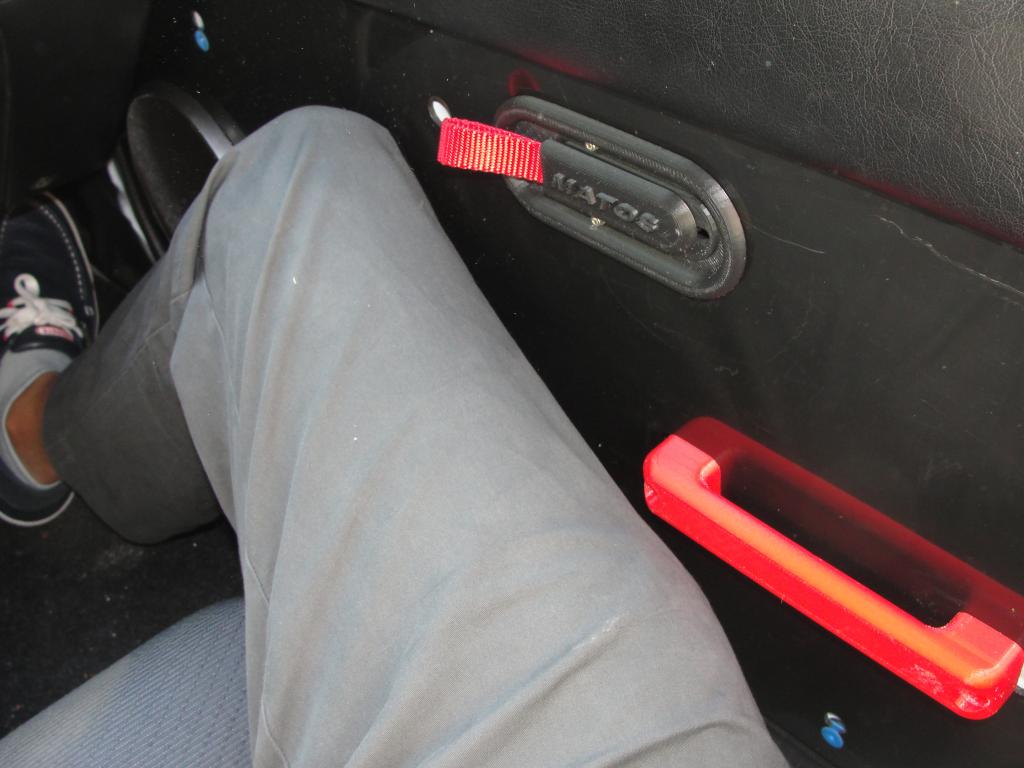 It's got great clearance for my leg, being shorter than the factory piece and only sticking out ~1" from the door panel as opposed to the ~2.5" of the factory piece