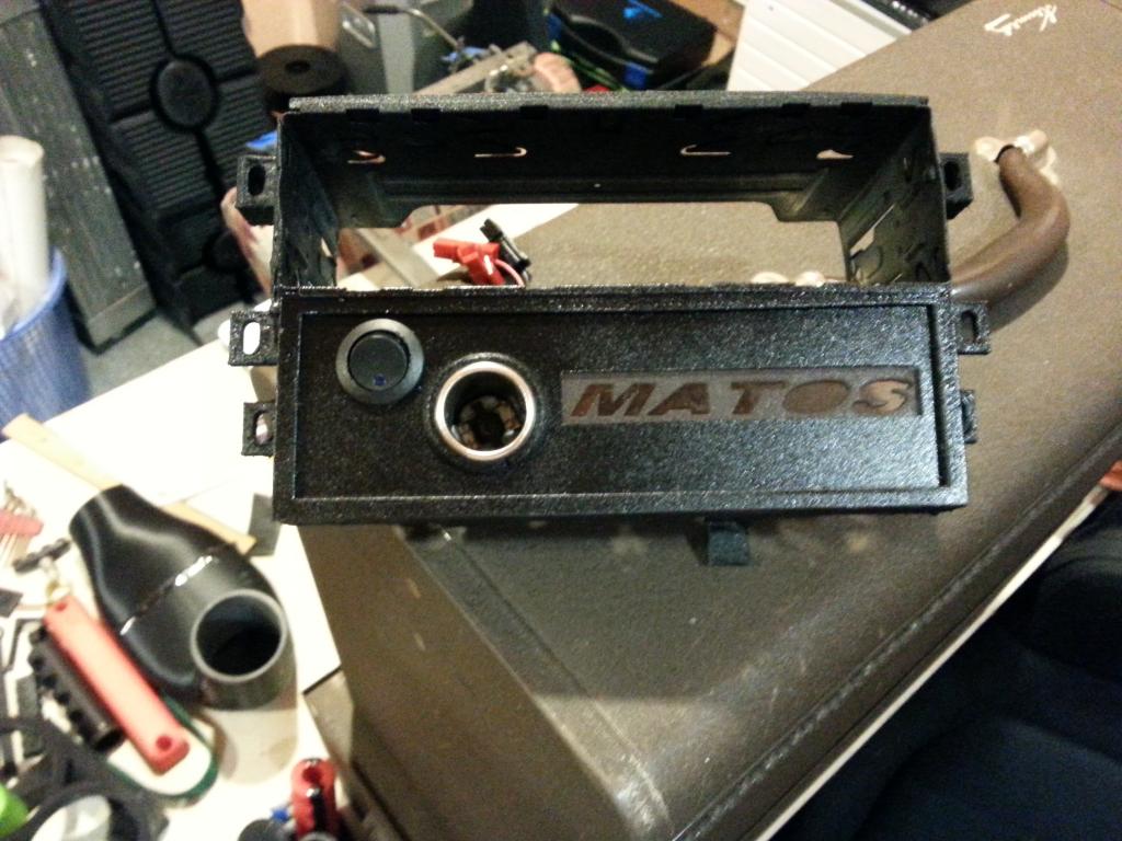 These horrible pictures cannot do it justice, it looks much better in person. The switch allows me to turn the cigarette lighter and the 12-24VDC converter on and off. I plan to get some LEDs or an electroluminescent sheet behind the letters, such that they glow.