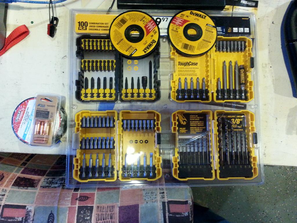 Getting back to the Elise seat, I headed off to Lowe's earlier today in order to get some cut off wheels, welding wire, and tips I needed to get the seat mounted. I ended up seeing this nice Dewalt set on sale, so I bought it. Now I have a bunch of accessories for my drills
