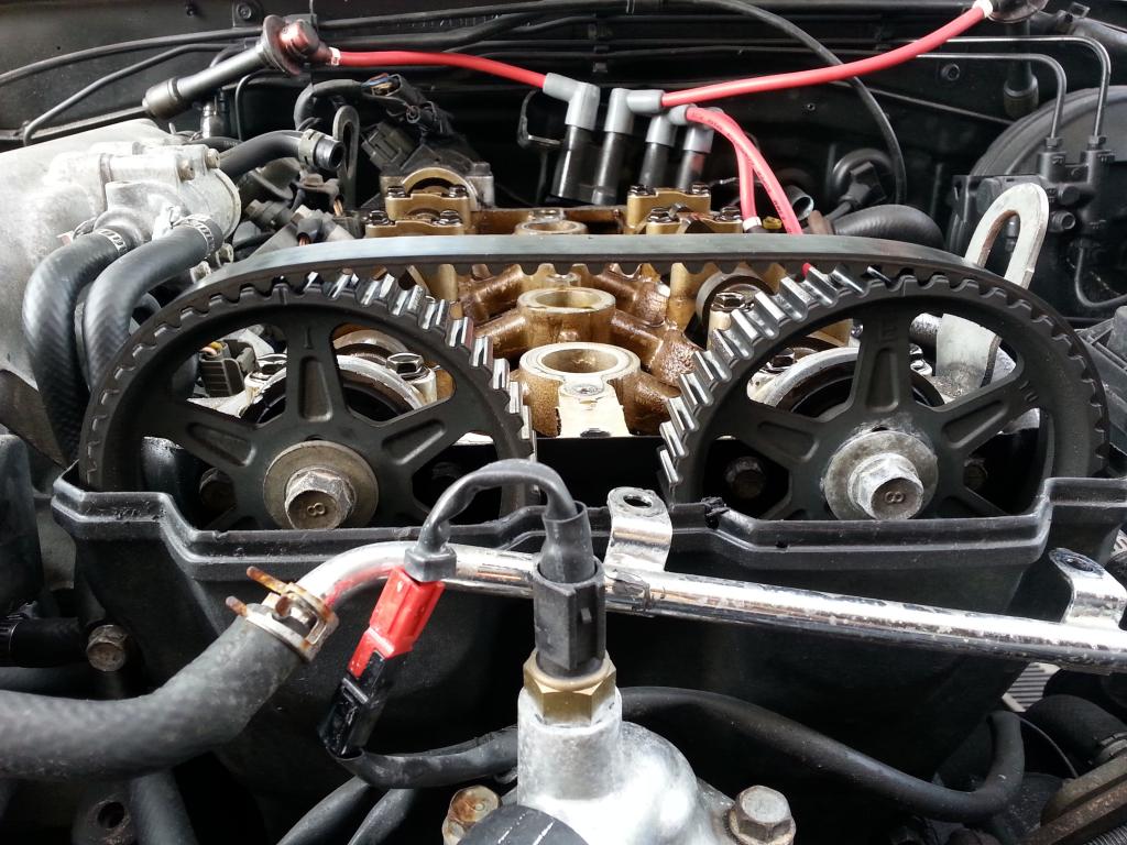 As it turns out, the timing was not off, the belt tension simply isn't set right. With the valve cover gasket changed and the spark plugs cleaned up, the car is starting much better. It's a lot easier to make a spark when oil isn't falling on you from above lol.