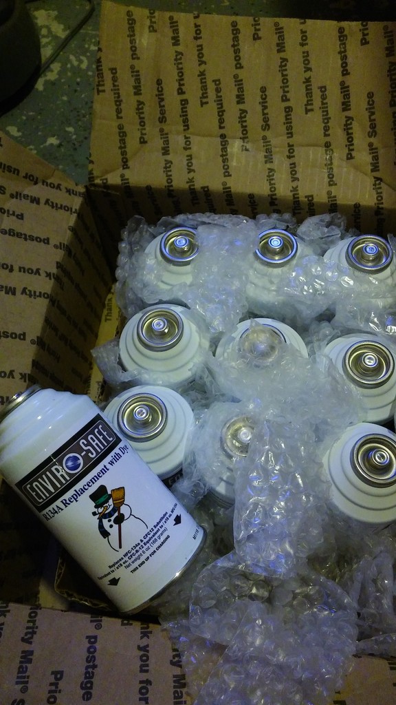 I'm finally getting around to fixing the air conditioning on my Miata. In the past, the car has been used as a night time cruiser and daily driven only during the winter months... about as much winter as we get in Miami anyway. I hesitated to do an R134a conversion due to the fact that conversions usually don't cool as well as straight R12. Fortunately, I found out about ESI12 which is compatible with both R12 and R134a systems. Apparently, this stuff cools better than R134a. I scored a bunch of cans of it on Amazon for around $50.