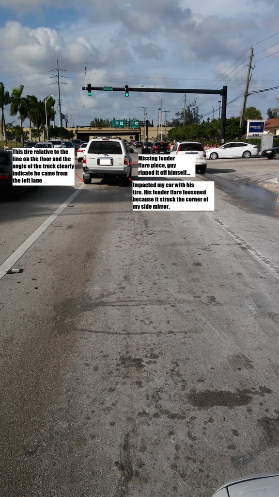 I was leaving work and coming down the right through lane. Guy cuts over from the left lane, side swipes me, and his tire has its way with my door and fender. He was coming so fast he almost went through the intersection and best of all, he has the nerve to get out and yell at me. All that happened to his 4Runner is the fender flare came loose, but in anger he went and ripped it off. He yelled a bunch of incoherent accusations and went to go get a picture of my tag and threatened me saying I was lucky his buddy was busy and couldn't come help him. I called him out and told him he ought to be embarrassed. This is a 64 yr old man, acting like a high school age bully, for shame! Worst of all, I looked him up and he works at my company, wonderful. Public service aid came over, got us to pull off the road, asked a bunch of questions, and handed us a report. Dude looks at me as we're getting in our cars and says "take it easy." He had cooled down by then, likely realized how silly he looked threatening a kid less than half his age that works at the same company as him.