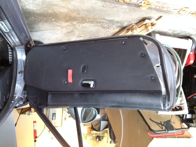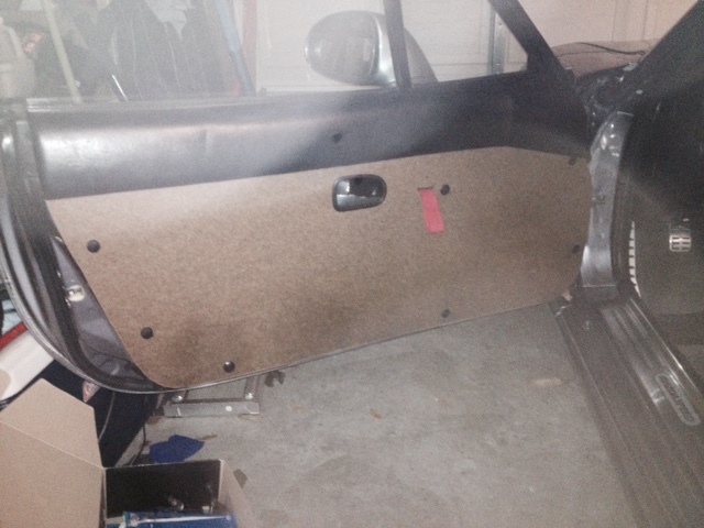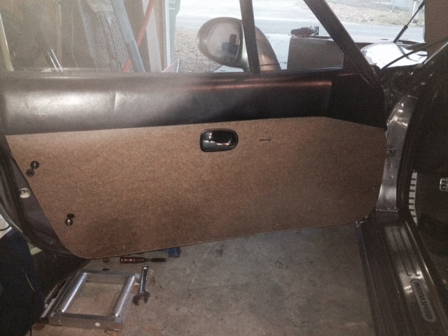 I removed my door panels and began a project of making door cards using the upper portion of NA panels. These panels started out as a 4'x8' sheet of 3/16" cardboard from Lowes. Cardboard was trimmed and first covered in headliner, then in black vinyl. I must say, I love the extra elbow room!