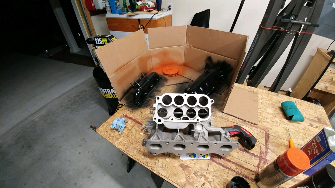 Got my throttle body, IACV, intake manifold, water pump pulley, and exhaust manifold sandblasted. Got some paint on these and began test fitting. Also got my GM LS Coils with a harness for only $60! So I’ll be making a bracket for them! Anyone know if OEM plug wires fit miata?