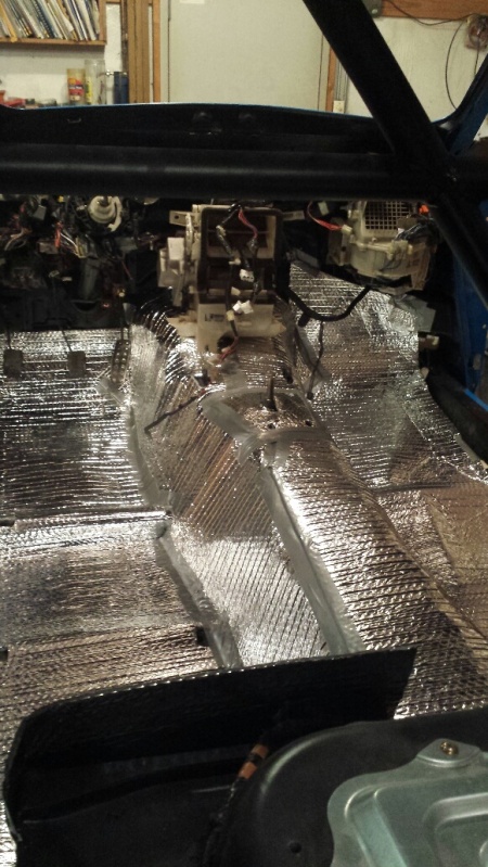Prepped for carpet. Finally found one. Should be here Monday. USed Reflectix from HD Racing. It cuts the heat, a bit of sound deadening, and it's cheap. One 25' roll just covers it.
