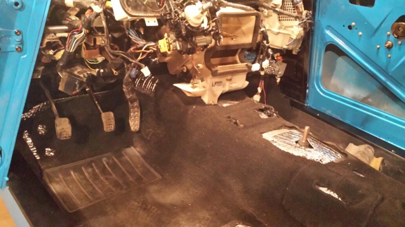 Not a lot to report. Got the carpet installed tonight. I powerwashed it yesterday. It's dusty from me walking around in there but it's decent. Surprising to have to trim a Miata carpet to something that is even smaller than that.