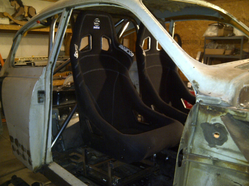 Got the seats in. I had to raise the seats from stock Miata height by 6" so I spent a lot of time figuring out that one. That and I had to move them inboard from the stock locations to clear the B pillar. Someone who owns a SAAB 96 said that he didn't know how they would fit with the tunnel in there. Well, they do and he didn't anticipate the power of someone who is building something essentially from scratch. Each was moved 3" inboard but because the bottom of the seat is flush with the top of the tunnel it worked. Sounds like the shifter location would be funky but your hand falls to the shifter even better than the stock location.